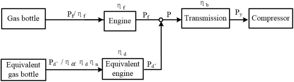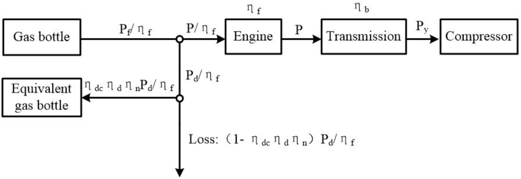 When the power load demand of the HPGHP system is lower than the engine operating power in the economical zone or the SOC value of battery packs is less than the set limit, the system enters the charging mode. The engine drives the compressor directly by the gearbox and charges the battery packs using the generator at the same time. Because the power of battery packs comes from the engine bottle, battery packs can be simplified as an equivalent gas bottle [13,14] as shown in Figure 4.