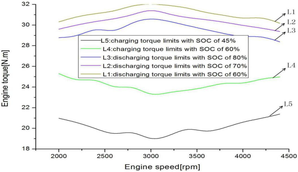 In Figure 7, L4 and L5 respectively represent the charging torque limits under 60% of SOC value and 50% of SOC value. Because the optimization objective functions are different under different SOC values, the value of L5 is lower than the value of L4. In order to ensure that SOC recovers from low levels to a normal level quickly, the charging torque limits are not allowed to increase when the SOC value is less than 45%.