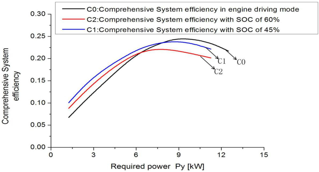 The distribution of the engine torque and motor torque are optimized, respectively, under different values of SOC, different engine speeds and different required powers. When the SOC value is at 45% with different engine speed, comparing the comprehensive efficiency with the normal efficiency, which is only driven by the engine in the charging conditions, the optimized comprehensive efficiency of the HPGHP system in the charging conditions is higher under low and medium demand loads, but becomes lower when the required power increases to a certain value. Hence, in order to improve the comprehensive efficiency of the HPGHP system, the charging conditions limits should be established. Meanwhile, the battery packs should be charged only when the required power is less than the charging power limit. As shown in Figure 6, the curve C0 represents the normal efficiency with the engine speed of 3200 rpm and the value is the product of the engine thermal efficiency and the engine transmission efficiency.