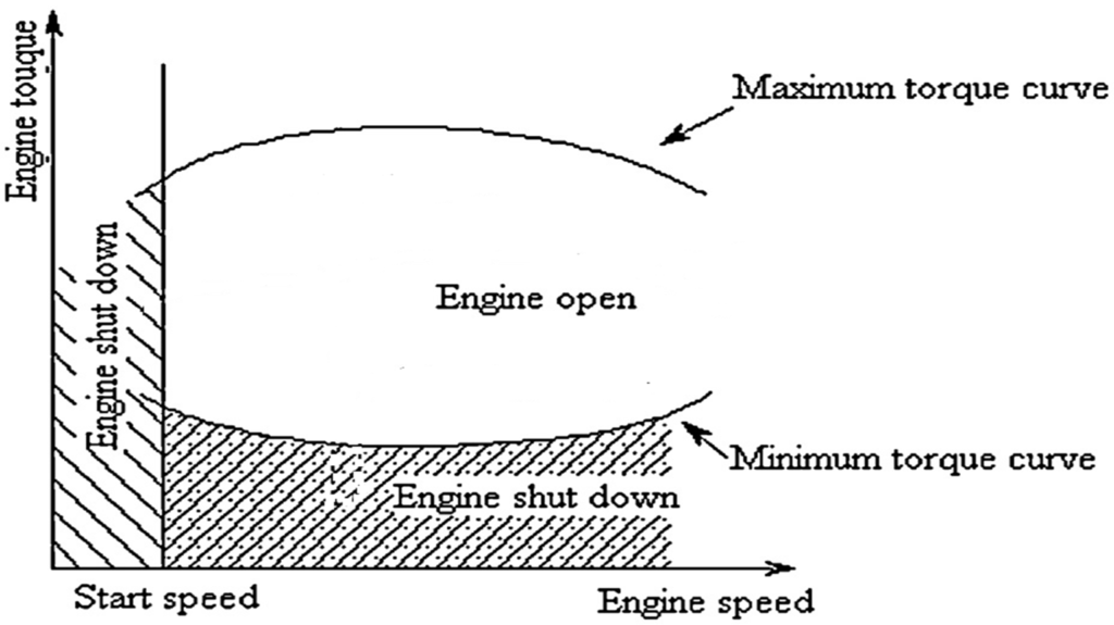 where Tfmax is the maximum engine torque when the engine speed is ω, N.m. Tdmin is the minimum allowed motor torque, N.m. Tdmax is the maximum motor torque when the motor is operating continuously, N.m. Pda is the actual maximum motor power when the SOC value is specific value. ωdbase is the basic motor speed when the SOC value is specific value, rad/s. This is expressed as follows: