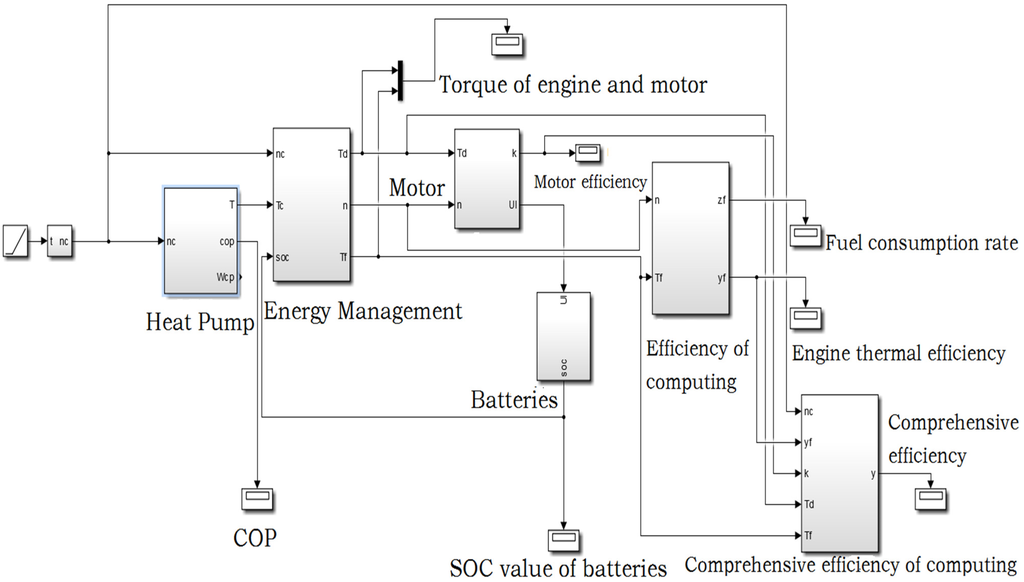 To evaluate the effectiveness of the proposed models, a steady-state model of the HPGHP system is established by Matlab/Simulink, and as shown in Figure 10, the gas engine economical zone control strategy, which is combined with the SOC value in real time, is implemented. Different components are coupled to each other by operating parameters. The input parameters are compressor speed and power, which correspond to the heating load. The heat pump module can generate the compressor power and the compressor torque. Based on the compressor required torque and the SOC value, the energy management strategy coordinates the distribution of power between the engine and battery packs. Then the motor power and efficiency are obtained by the motor module, the change of SOC value can be simulated and the engine thermal efficiency is obtained by the engine module, and finally the fuel consumption and comprehensive efficiency of the HPGHP system can be obtained.