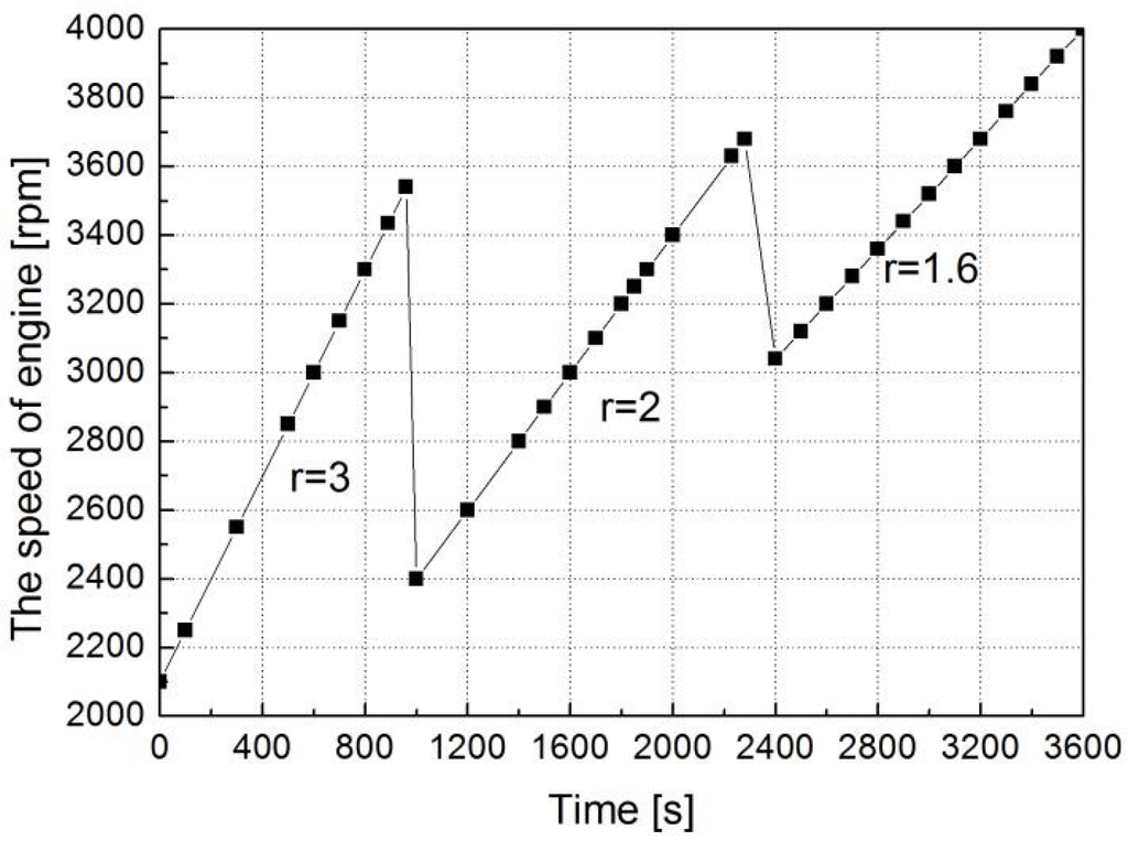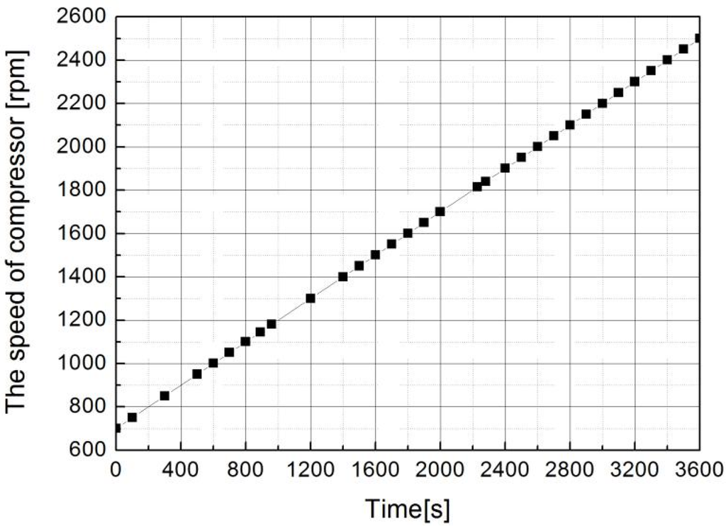 In the simulation process, the input compressor speed corresponds to the engine speed, as shown in Figure 11 and Figure 12. During 3600 s of run-time, the compressor speed increases linearly from 700 to 2500 rpm and the engine speed ranges from 2000 rpm to 4000 rpm. The experimental parameters of the system are as follows: the outdoor dry bulb temperature is 7 °C, the condensation temperature is 46 °C and the evaporating temperature is −5 °C. The initial SOC value is set to 0.65 in this paper, for the convenience of calculation, the charging/discharging torque are a function of both the engine speed and SOC value. which is shown as T = f(SOC, ωf). As the SOC value is around 0.6, the charging torque and discharging torque are fitted by the value of simulation, as is shown as Equations (27) and (28). The selection of the motor charging or discharging torque can meet the engine economic zone and take as big a value as possible in this paper.