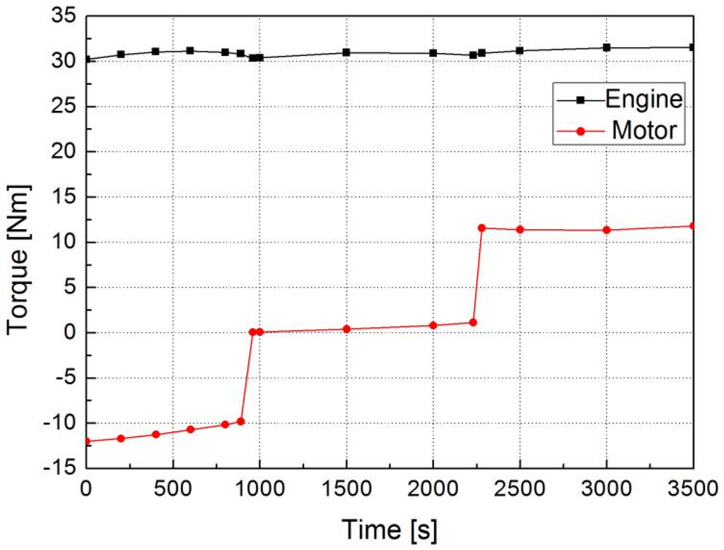 Figure 13 is the simulation curve of the SOC value and Figure 14 is the simulation curve of both the engine and the motor torque under different modes. When the compressor speed ranges in 750–1150 rpm, because the compressor power demand is low and the HPGHP systems operates in mode C, the engine torque remains around 31 Nm, the motor charging torque ranges from −12.5 to −10 Nm and the SOC value gradually increases to 0.705 from the initial value of 0.65. When the compressor speed range is 1150–1900 rpm, because the compressor demand power is medium and the motor stops operating at this moment, the engine torque remains around 31 Nm, the discharging motor torque remains around 0 Nm and the SOC value decreases by about 0.07, the HPGHP systems can be considered to operate approximately in mode D. When the compressor speed is between 1900 and 2400 rpm, because the compressor demand power is high and the HPGHP systems operates in mode L, the motor discharging torque and the engine torque remain around 11 Nm and 31 Nm, respectively, and the SOC value is reduced from 0.7 to 0.58.