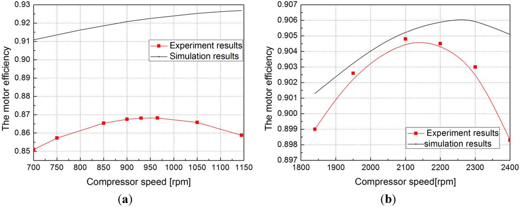 Figure 15 presents the simulation curves of motor efficiency for different modes. The motor efficiency of simulation and experiment results reaches a maximum value of approximately 0.930 and 0.868 when the compressor speed is 1150 rpm and 950 rpm in mode C, respectively. The maximum difference between the simulation and experimental data is 6.2%. In addition, the motor efficiency of the simulation and experimental results reaches a maximum value of approximately 0.906 and 0.9048 when the compressor speed is 2100 rpm and 2280 rpm in mode L, respectively. The maximum difference between the simulation and experimental data is 0.7%. The motor stops operating in mode D.