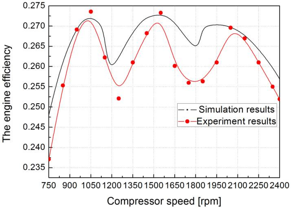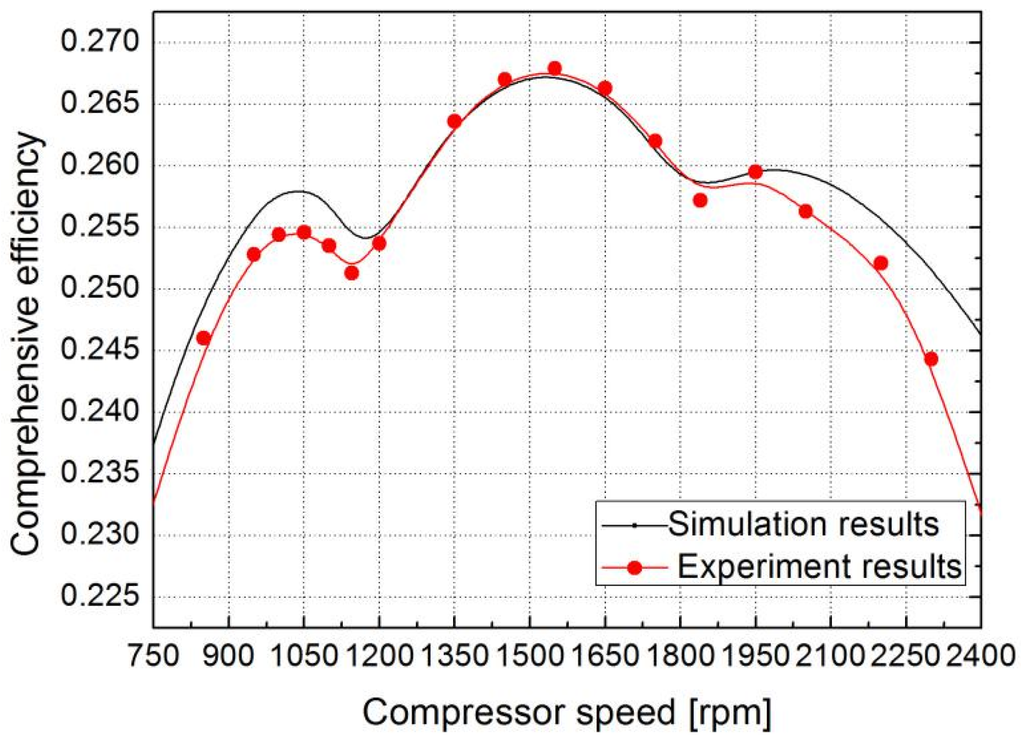 Figure 16 and Figure 17 present the simulation curves of engine thermal efficiency and comprehensive efficiency for different modes. The engine thermal efficiency and comprehensive efficiency firstly increase to a maximum value and then decrease with compressor speed, respectively, in different modes. According to the simulation results, the engine thermal efficiency and comprehensive efficiency reach a maximum value of approximately 0.2723/0.2581 when the compressor speed is 1025 rpm/1075 rpm, respectively, in mode C. The engine thermal efficiency and comprehensive efficiency reach a maximum value of approximately 0.2727/0.2648 when the compressor speed is 1575 rpm/1475 rpm, respectively in mode D. The engine thermal efficiency and comprehensive efficiency reach a maximum value of approximately 0.2708/0.2600 when the compressor speed is 2000 rpm/1950 rpm, respectively, in mode L. Overall, the engine thermal efficiency and comprehensive efficiency of the HPGHP system ranges respectively from 0.2400–0.2750, 0.2300–0.2700. Because the instantaneous change of SOC values corresponds to the charging/discharging torque in the simulation, and the SOC ranges of the interval (every 10% ranges) corresponds to the charging/discharging torque in the experiment, the experimental data and simulation value are different. In addition, the engine runs in the economic zone that can meet the full load demands of the HPGHP systems and the motor and battery packs stop running in mode D, so the simulation and experimental data of the comprehensive efficiency is close. Overall, the maximum difference between simulation and experiment data of the engine thermal efficiency and comprehensive efficiency is 0.9% and 1.2%.