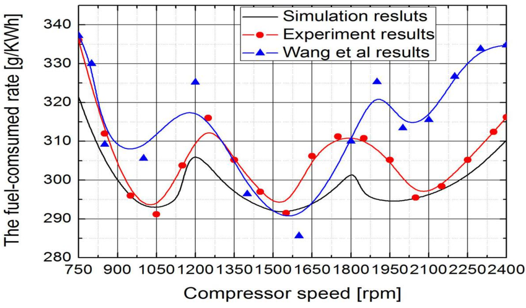 Figure 18 shows the simulation and experimental fuel consumption rate curves. With the increase of compressor speed, the HPGHP systems operates in different modes, and the fuel consumption rate firstly decreases to a minimum value and then increases with compressor speed in different modes. According to the simulation results, the fuel consumption rate reaches a minimum value of approximately 292.5 g/(kW·h), 291.3 g/(kW·h), 294.7 g/(kW·h) when the compressor speed is 1075 rpm in mode C, 1550 rpm in mode D, 1950 rpm in mode L, respectively. In general, the fuel consumption rate range is 291–330 g/(kW·h). Because the fuel consumption rate is associated with the engine thermal efficiency, the maximum difference between the simulation and experimental fuel consumption rate data is 3.3%. Due to the novel gas engine economical zone control strategy, the experimental fuel consumption rate data is lower than analyzed in Wang et al. [9] in mode C and L, as the engine operates alone in mode D, the different between the experimental fuel consumption rate data and that analyzed in Wang et al. [9] is not great. In general, the experiment data of fuel consumption rate is about 1.6% less than that analyzed in Wang et al. [9].