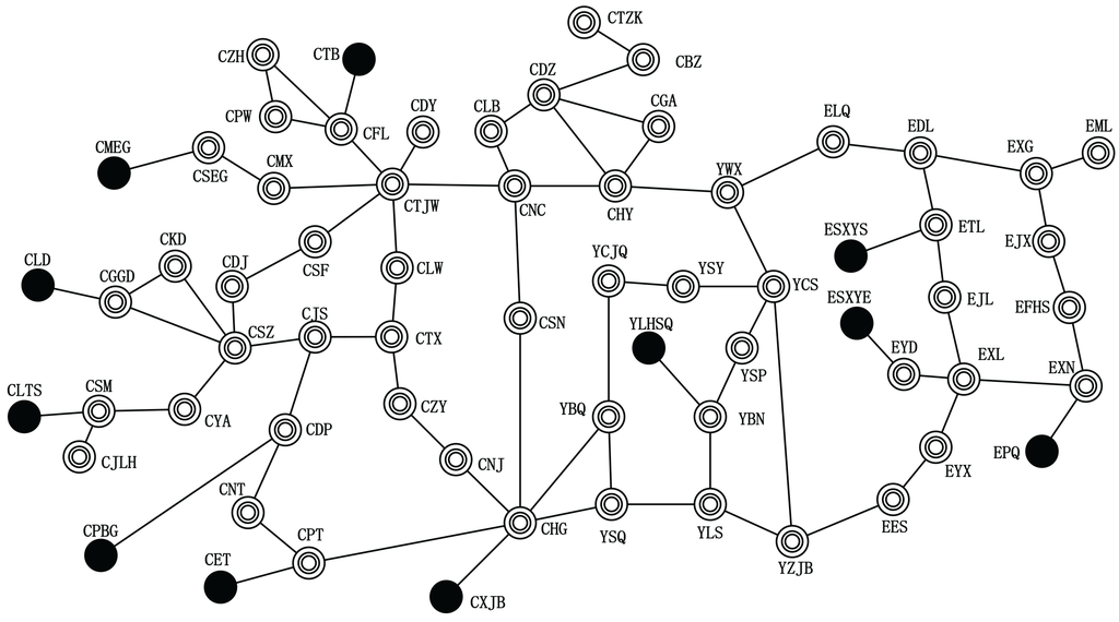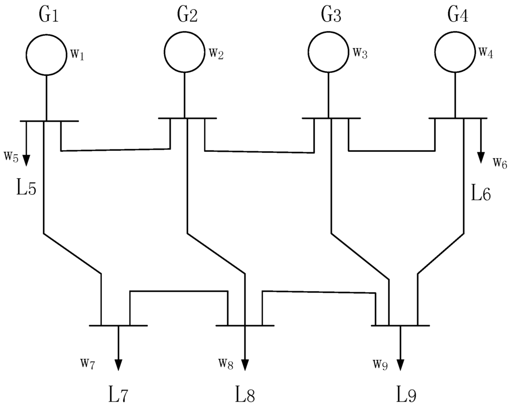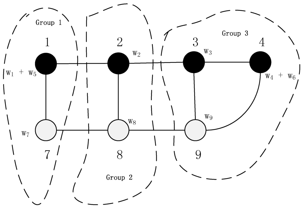 The power system can be represented by an undirected, connected and node-weighted graph , where V is the set of n nodes, E is the edge set and W is the set containing the node weights. The node set V is composed of two mutually exclusive subsets and , i.e., and , where is the set of m generator nodes and includes the n–m load nodes. Let () denote a node in V and () be a generator node in . In a real situation, generators and loads may be situated at the same node. Thus, if the generation power exceeds the load power, we regard this node as a generator node; otherwise, it is a load node. The element is included in E only if there is a transmission line between nodes i and j. Each element is associated with a parameter , which represents the capacity of the corresponding transmission line. Actually, the splitting strategy is a set of edges belonging to E. If the node is a generator node, then its corresponding is a positive number; otherwise, is negative. For convenience, we view the that only acts as the connecting node without any power generation or consumption (i.e., ) as a load node.