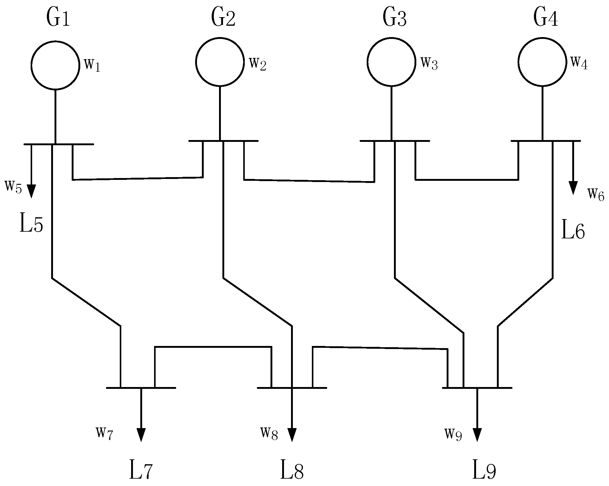 The power system can be converted into a graph, where the nodes represent the generators that produce power and the loads that consume power, and the edges denote the transmission lines of different voltage grades. Each node has an associated weight that indicates the generated or consumed power. A positive (respectively, negative) number is used to indicate the weight of the generator (respectively, load) node. For example, Figure 1 shows a system that includes four generators and seven buses, where – are loads, – are generators and – are associated weights. The corresponding topological graph is given in Figure 2, where the generators and loads are represented by black and white circles, respectively. The generators and loads that are connected to the same bus, e.g., and , can be simplified into an equivalent generator. The weights of the equivalent generators are the net output power; for example, the weight of Node 1 in Figure 2 is equal to –.