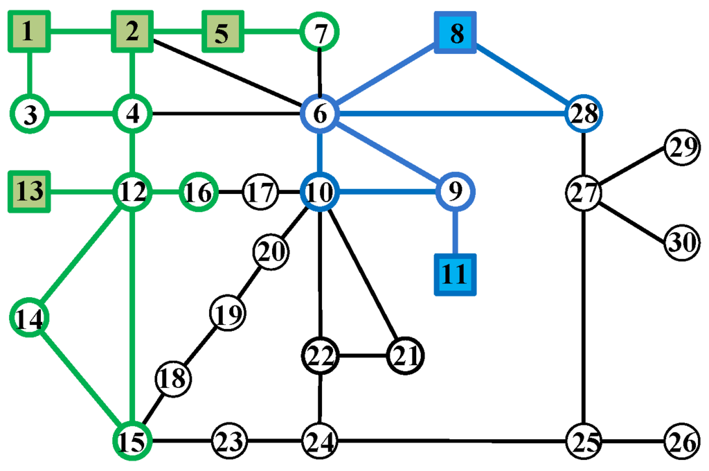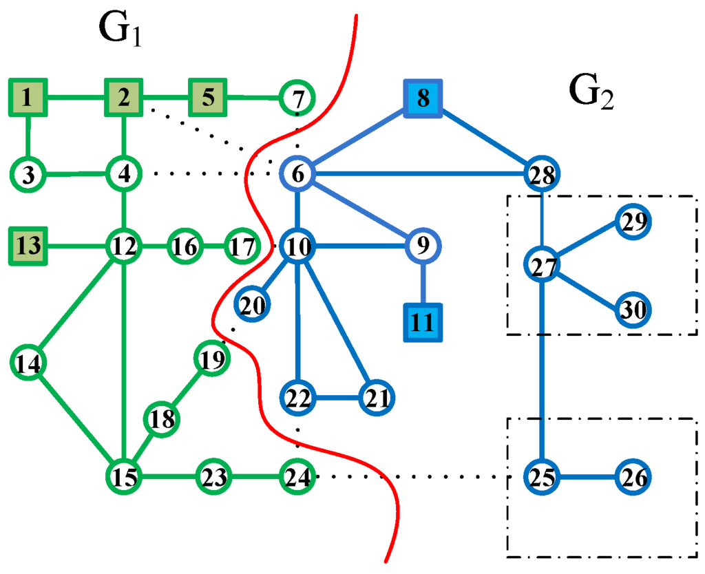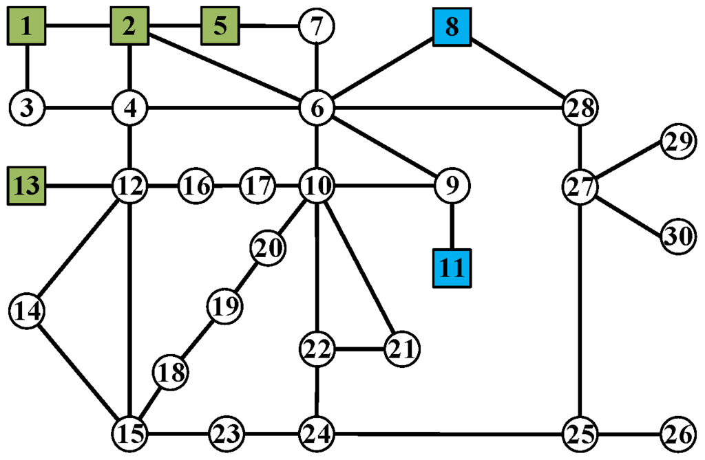 The input data of this algorithm are the information of graph G, which includes the set of nodes V, the set of generator nodes , the set of node weights W and the adjacency matrix A, the number u of islands to be divided and the coherent generator set in the k-th island. The 30-node power system used in our example is shown in Figure 3, where the load nodes (respectively, the generator nodes) are represented by circles (respectively, squares). Two coherent generator sets are assumed to be {1, 2, 5, 13} (coherent generator Set 1) and {8, 11} (coherent generator Set 2).