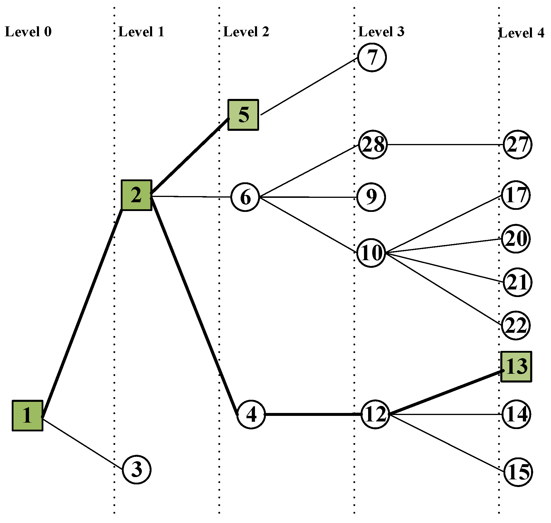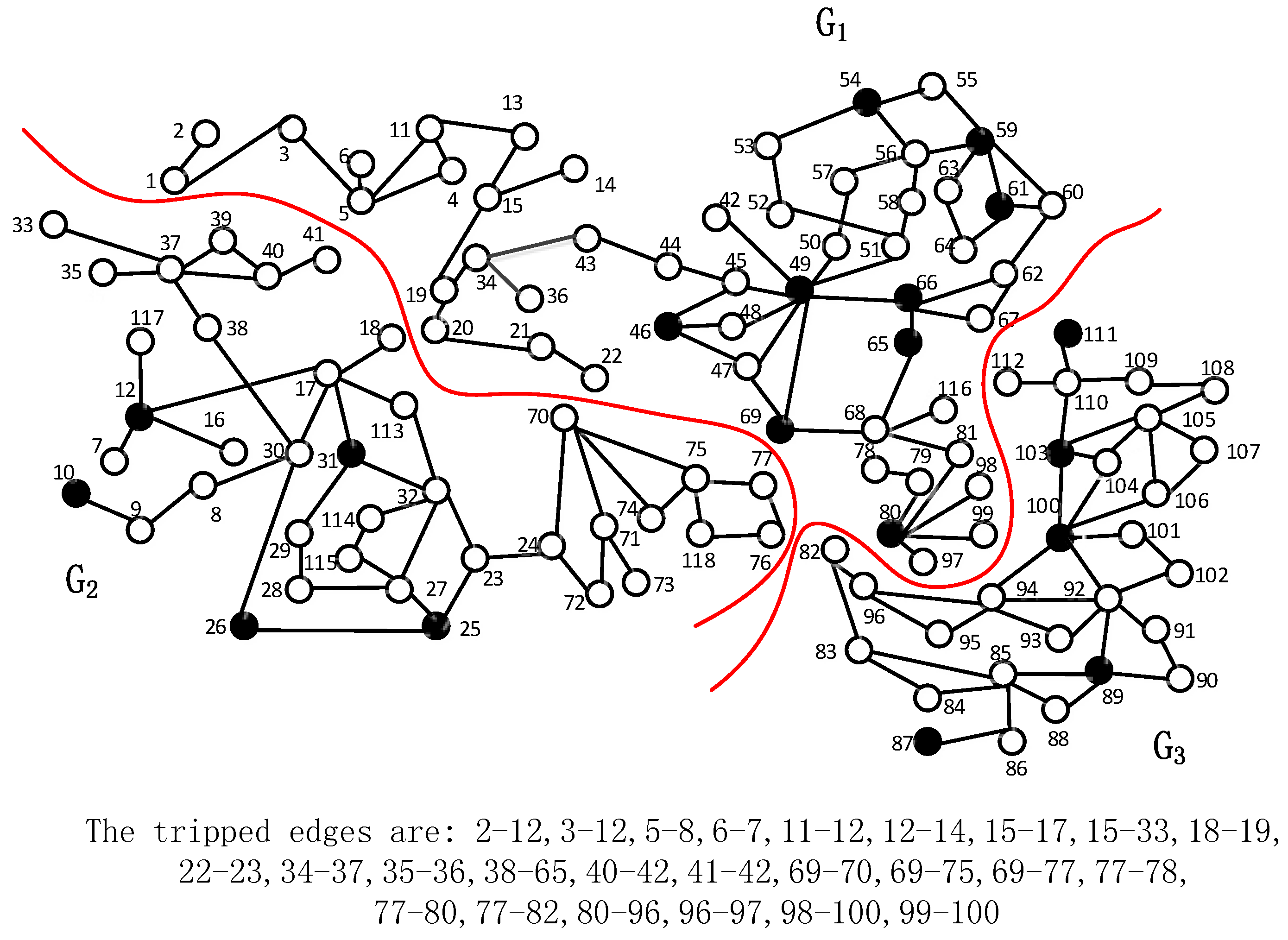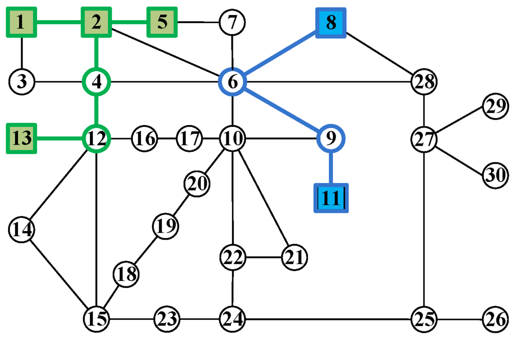 Figure 4 shows the constructed tree associated with the coherent generator Set 1 with generator Node 1 being the root node, where the critical Subgraph 1 is highlighted by bold lines. Obviously, the nodes in the first level is generator Node 2 and load Node 3, since they are adjacent to generator Node 1. Then, the Level 2 nodes originated from generator Node 2 are generator Node 5 and load Nodes 4 and 6. Since load Node 4 already exists in the tree, it cannot be the child node of load Node 3. Since generator Node 8 belongs to the second coherent generator set, it cannot be the child of load Node 6. Following the above extension rules, we construct the tree until generator Node 13 is included. The critical subgraph contains all generator nodes and consists of all paths from the generator nodes to the root node. In Figure 4, the critical Subgraph 1 is composed of paths (1, 2, 5) and (1, 2, 4, 12, 13). Figure 5 presents the 30-node graph in which the critical subgraphs associated with all coherent generator sets are marked in bold.