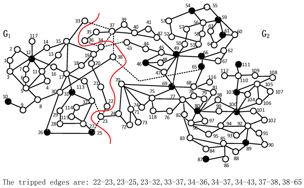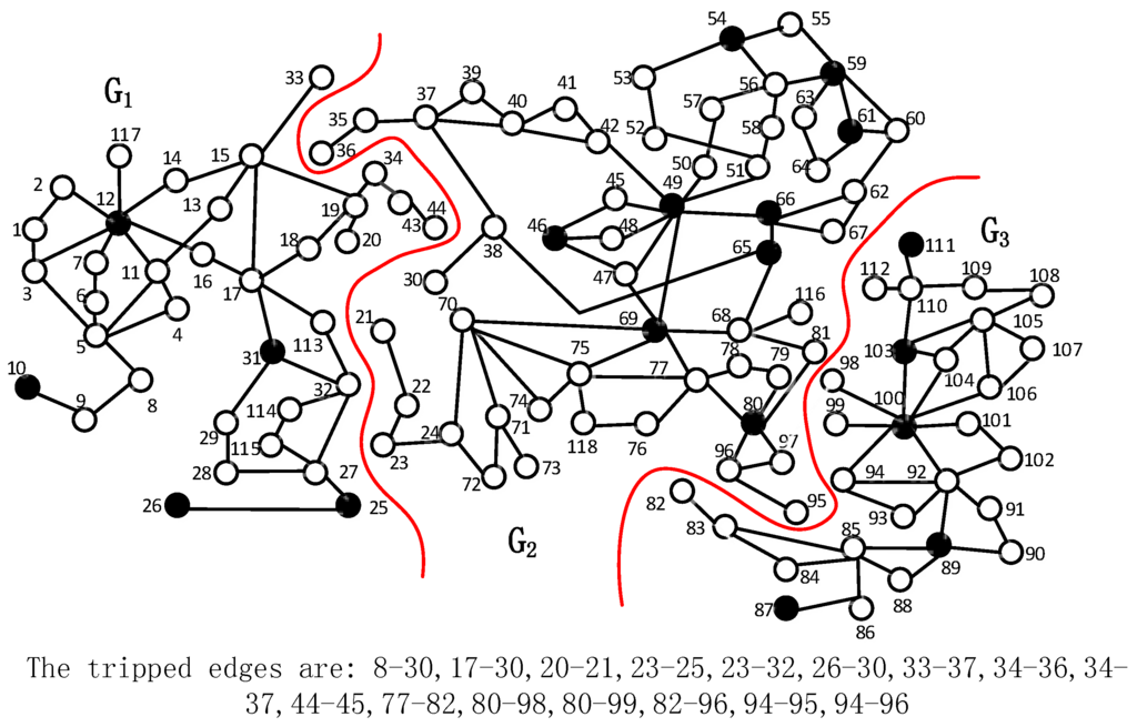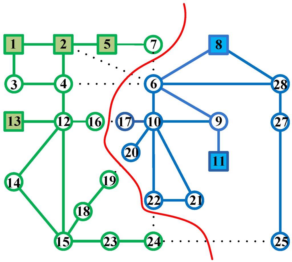 The island is constructed from the critical subgraph k by adding the remaining load nodes that are not included by the critical subgraphs. At the beginning, we denote the k-th island by , which is equivalent to the critical subgraph k. The set of nodes in , denoted by is called the Layer 0 nodes of . The remaining node adjacent to any node in is called the Layer 1 node of . In Figure 5, the sets of Layer 1 nodes of and are { 3, 7, 14, 15, 16} and {7, 10, 28}, respectively. Next, we generate by assigning the Layer 1 nodes to . If a node is a Layer 1 node of multiple islands (e.g., load Node 7 in Figure 5), we assign it to the island, such that the resultant total power imbalance of all islands is minimal. Figure 6 shows the 30-node graph in which and are marked in bold, and Load 7 is included in . The remaining nodes are {17, 18, …, 30}, and the sets of Layer 2 nodes of and are {17, 18, 23} and {17, 21, 22, 27}, respectively. In the following steps, the islands gradually grow until the expansion cannot be performed. We can get the initial solution for the 30-node power system as shown in Figure 7, where the boundary nodes are {4, 6, 7, 10, 17, 19, 20, 22, 24, 25}. In this solution, the transmission lines tripped are {(6, 7), (2, 6), (4, 6), (17, 10), (19, 20), (22, 24), (24, 25)}.