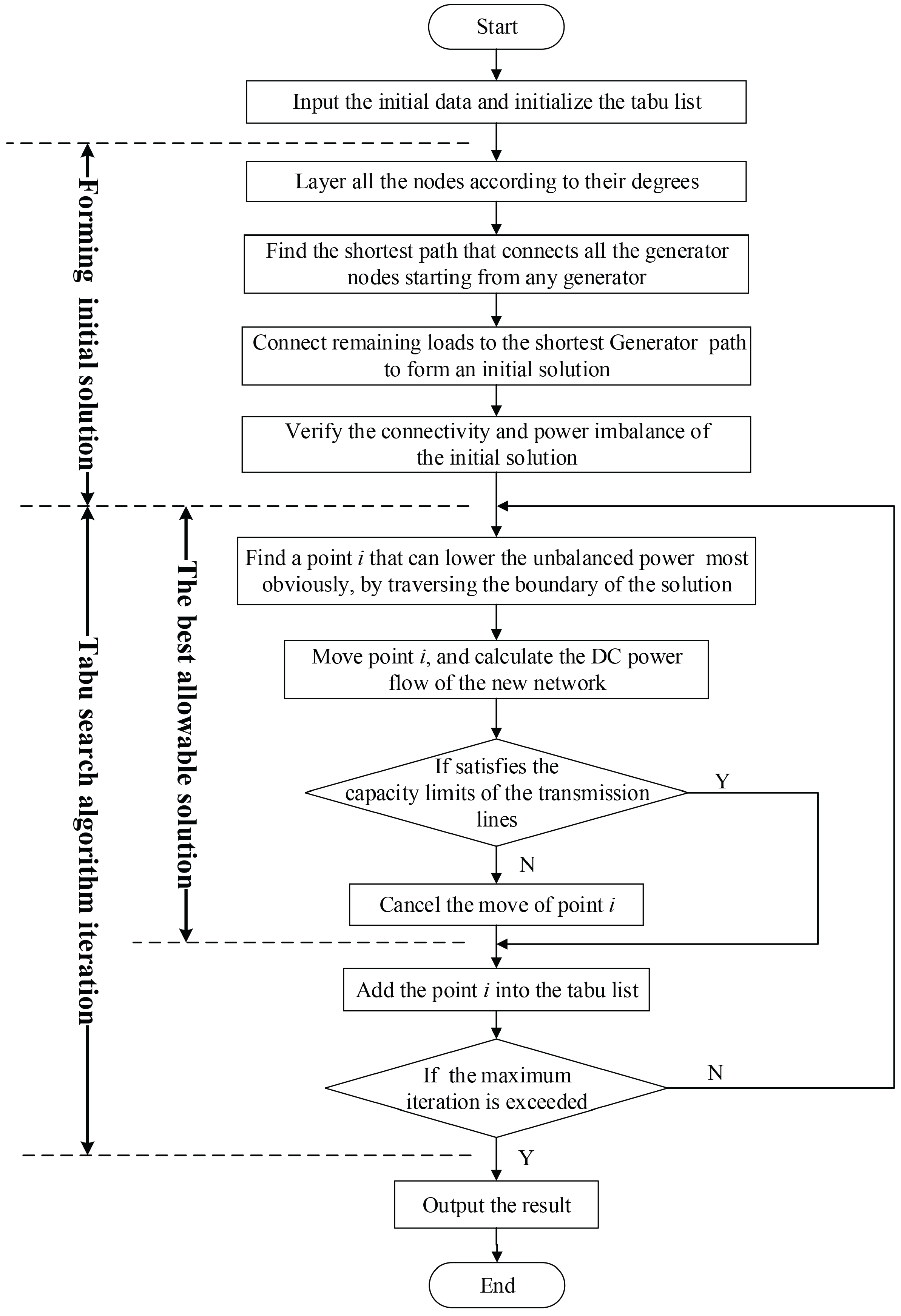 The tabu search algorithm employs a tabu list to forbid the recently visited solutions from being revisited. In our algorithm, the prohibition rule is: a node i that is removed from its current island cannot be assigned back to for the next L iterations, where L is called tabu tenure. In the tabu list, we store the nodes that have been moved within the previous L iterations. A move is considered as tabu if it attempts to move the nodes in the tabu list. The tabu restriction can be overridden if the move satisfies the following aspiration criterion: the solution resulting from the tabu move is better than the current best solution. The solutions in the neighborhood that are generated by the non-tabu moves or by the aspiration criterion are called allowable neighbors. We sort all allowable neighbors in ascending order of the values of their total power imbalance. The one ranked at the first place is selected to be the next incumbent solution. We terminate the tabu search process when maxIterconsecutive iterations are unable to update the current best solution.