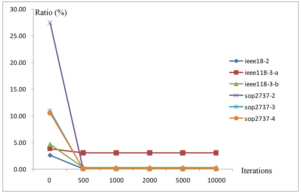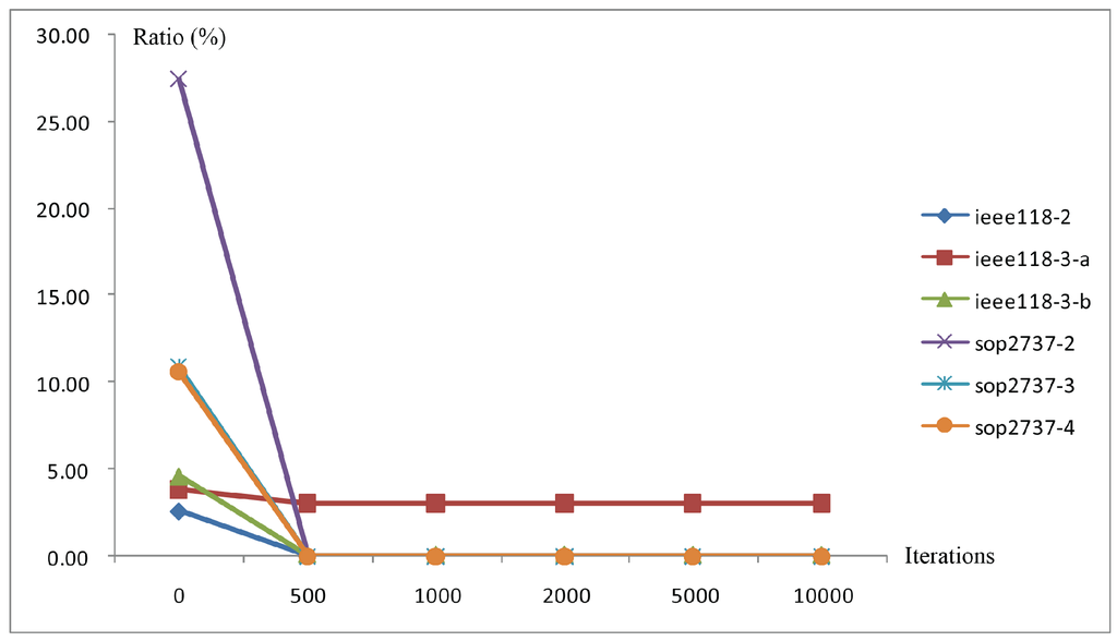 We report in Table 2 and Table 3 the computational results of the instances produced by our tabu search algorithm. In each table, the first column gives the names of the test instances. Each block corresponds to a certain number of iterations. For example, the values of “Ratio (%)” and “Time (s)” under the block “1000 iterations” is the ratio of the total power imbalance obtained at the end of the 1000th iteration to the total generation power and the corresponding computation time. The block “0 iteration” shows the results of the initial solutions generated by the two-stage approach (see Section 4.2). In the last row of each table, we present the average “Ratio (%)” and “Time (s)” of these instances.