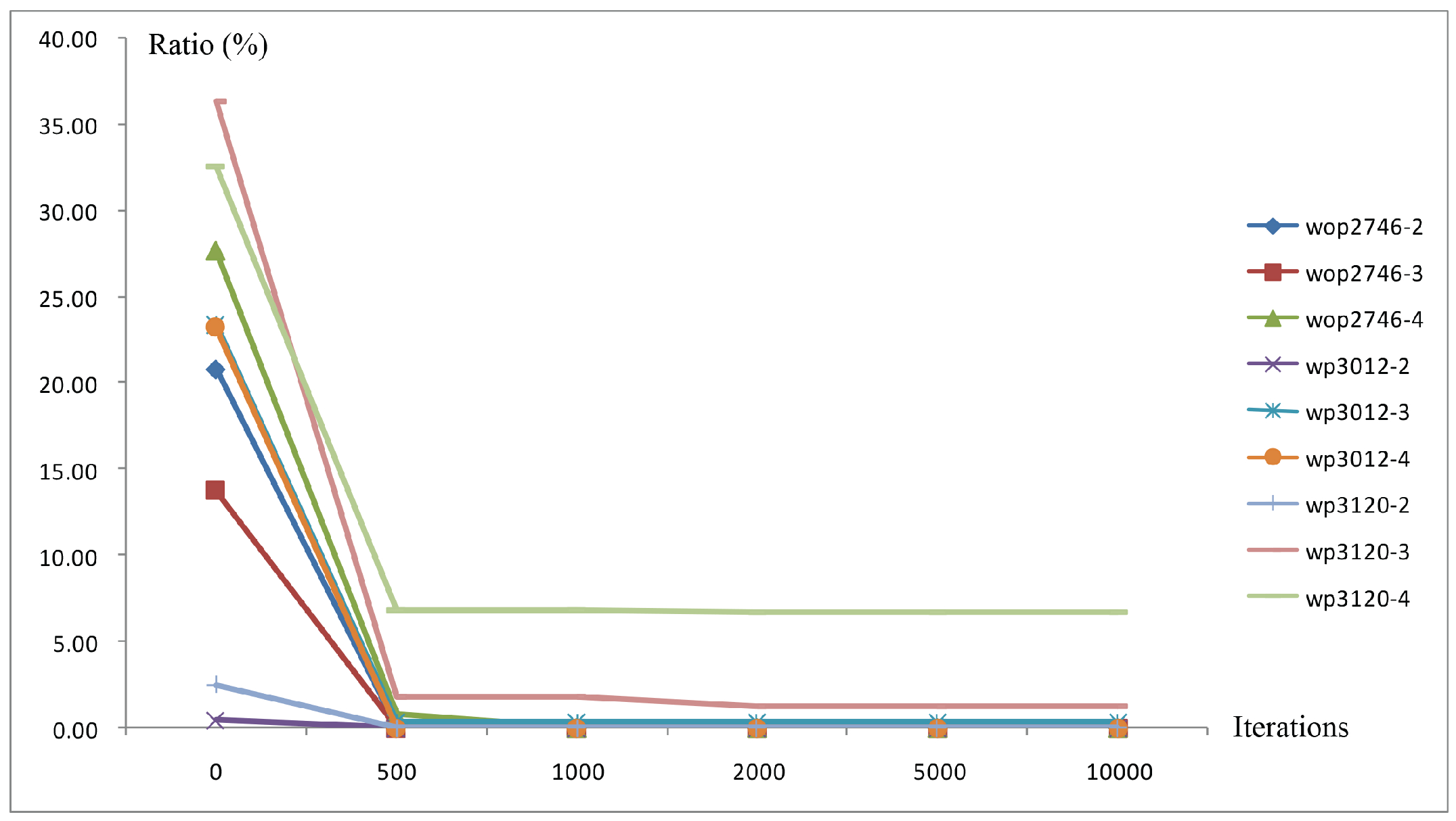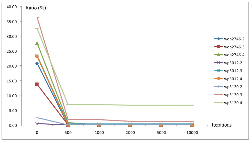 | Instance | 0 iterations | 500 iterations | 1000 iterations | 2000 iterations | 5000 iterations | 10,000 iterations | ||||||||||