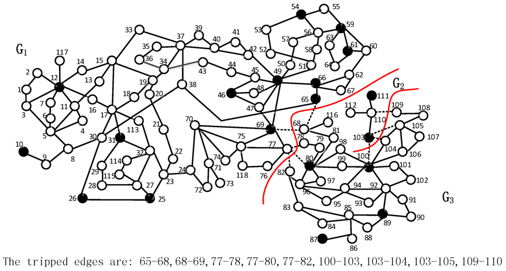 In [7], a two-stage ordered binary decision diagram (OBDD) method [17] was presented to find islands with minimal generation-load imbalance. However, this method can only deal with the small-scale power network that usually contains less than 40 nodes. As done by [8,18], the large-scale power system needs to be simplified before being split using this method. Based on slow coherency, You et al. [10] and Yang et al. [19] presented an islanding algorithm by first constructing a small subnetwork using the center bus. Then, a brute-force search is applied to the subnetwork to determine the edge set whose removal results in the islands with the minimum generation-load imbalance. A graph-based method was introduced, which first simplifies a large-scale power system into a smaller network and then applies a multi-level recursive bisection method to partition the reduced network into the sub-networks with the minimum generation-load imbalance [20]. They proved the effectiveness of their approach by simulation results on the 14 August 2003 blackout in North America. Recently, Trodden et al. [21] proposed a new method for controlled islanding that respects the voltage and reactive power constraints. In this paper, the authors approximated the AC power flow using a piecewise linear line and then split the network into islands using a mixed integer linear programming model.