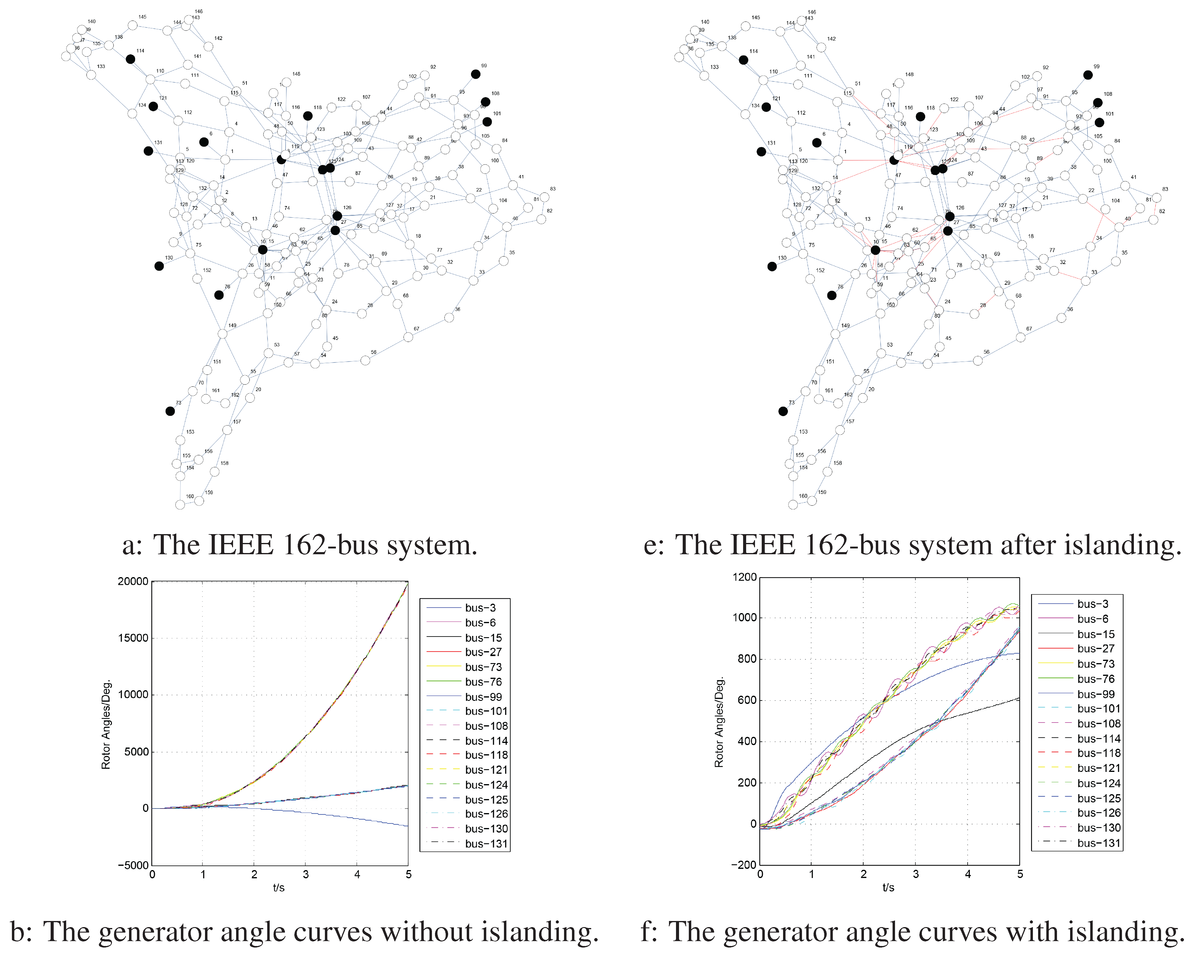 The 162-bus system consists of 17 generators, 162 nodes and 284 edges and has a capacity of 15,056.7 MW. All time-domain simulations for IEEE 162-bus system are performed using PSD-BPA, which is a component of the software package developed by the Power System Department of China Electric Power Research Institute [39]. We assume that at s, a three phase-to-ground solid fault happens at the middle of Line 3-50, and this fault is cleared after 0.325 s. If the system splitting measures are not taken, the figures of the generator angle curves, bus voltage curves and generator frequency curves can be observed from Figure 19a–d.