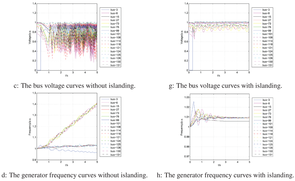 Figure 22d–f show the dynamic response of the generators after islanding. We can also see that two islands are successfully created with frequencies between 0.9975 and 1.0120 p.u. The voltage magnitudes shown in Figure 22e lie within [0.95 p.u., 1.05 p.u.], which indicates that this system is stable. These results indicate that our algorithm plays an important role in effectively preventing the blackout.