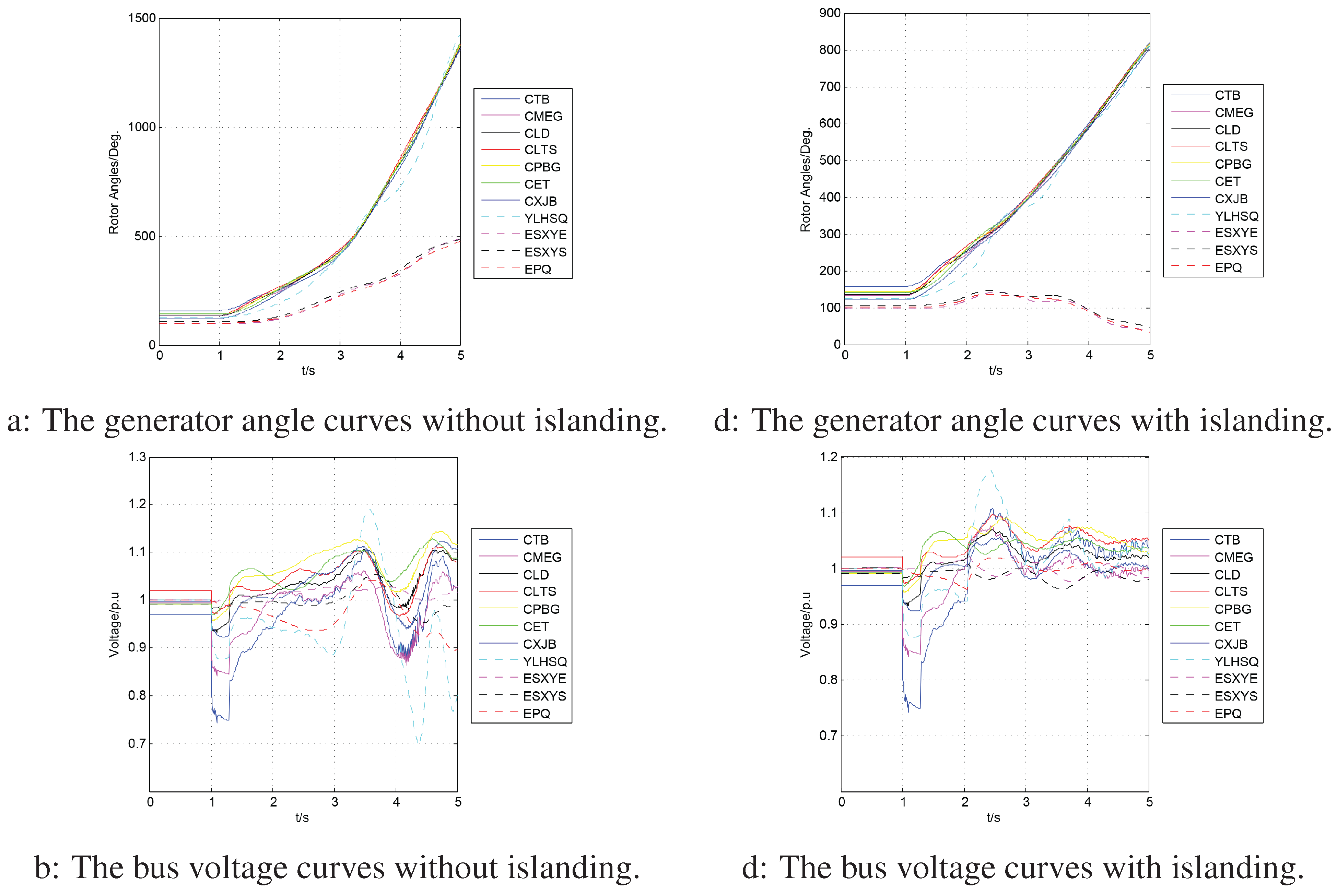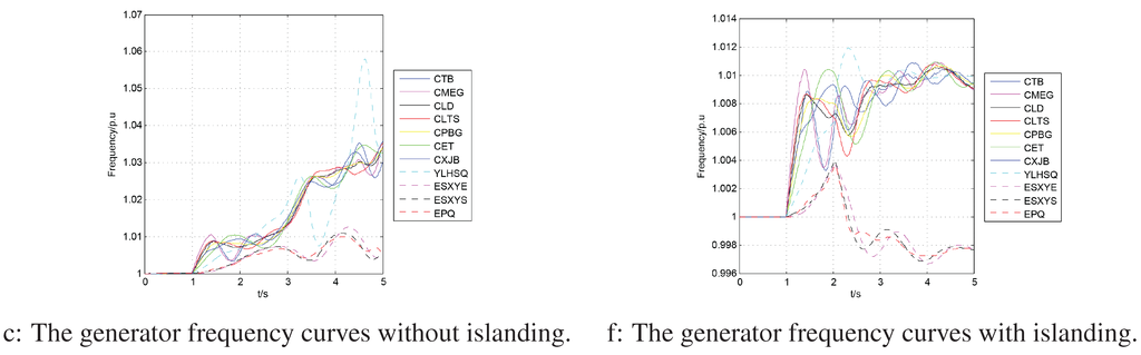 We assume that at time s, a three phase-to-ground fault occurs near bus CTJWat Line 36 and is cleared after 0.3 s. The power angle, voltage and frequency curves of generators are shown in Figure 21a–c. It can be seen from Figure 21a that within a short time after the fault is cleared, the generators are divided into two groups: {CTB, CMEG, CLD, CLTS, CPBG, CXJB, YLHSQ} and {ESXYS, ESXYE, EPQ}. As observed from Figure 21b,c, if the system is not split, the voltage magnitudes of the majority of the generators are beyond the range of stable operation, which lies in [0.95 p.u., 1.05 p.u.]. The frequencies of the generators increase considerably, and if no control actions are taken in time, the system may quickly collapse. In this case, the system needs to be split at 3 s. The islanding solution found by our algorithm is shown in Figure 22. Table 6 summarizes the best islanding solution and post-separation control measures for this test case. This solution was found by our algorithm using approximately 30 ms, and the islanding was conducted at 2.06 s. After islanding, 11 generators are assigned to specific islands, as shown in Figure 22.