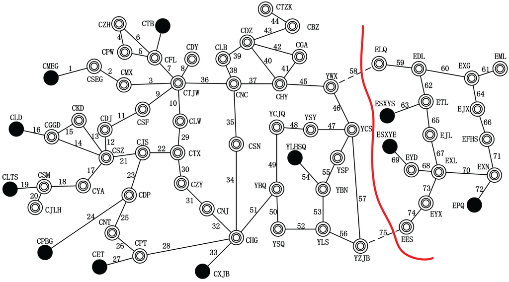 We employ a real power system in Central China to demonstrate our islanding algorithm. This power system contains 1713 buses. We reduce this system to the one with 11 generator buses, 55 load buses and 75 lines, which is shown in Figure 20. In a certain operation mode, the total active power output of the generators is 21,136 MW, and the total active power consumption of loads reaches 20,990.4 MW. All time-domain simulations for this power system are also performed using PSD-BPA.