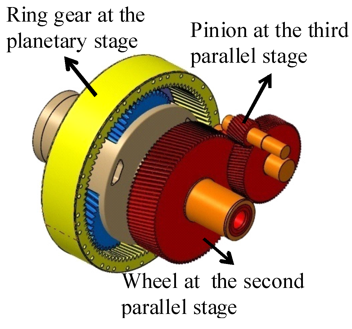 HSS is very sensitive to disturbances from the generator. The loads with higher frequencies can be filtered when transmitted from HSS to LSS [6,8,12]. A purely torsional drive train with nine degrees of freedom (DOFs) is essential for investigation of the dynamic response. In this work, it consists of one planetary stage and two parallel stages, and the computer-aided engineering (CAE) model is shown in Figure 1. It is assumed that three planets share the same loads at any time. Then the three can be equalized to one planet meshing with a ring and sun gear. The meshing force in the transversal plane and reaction torque on the gear can be expressed as follows:
