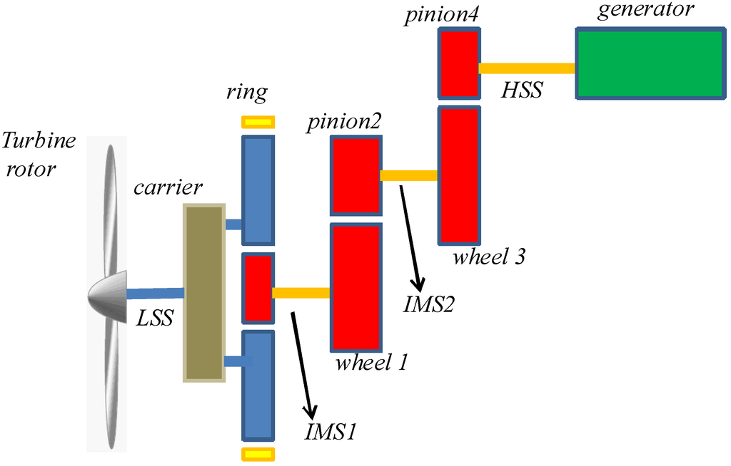 Schematic of the drive train. LSS: low-speed shaft; IMS1: intermediate shaft between stage 1 and stage 2; IMS2: intermediate shaft between stage 2 and stage 3.