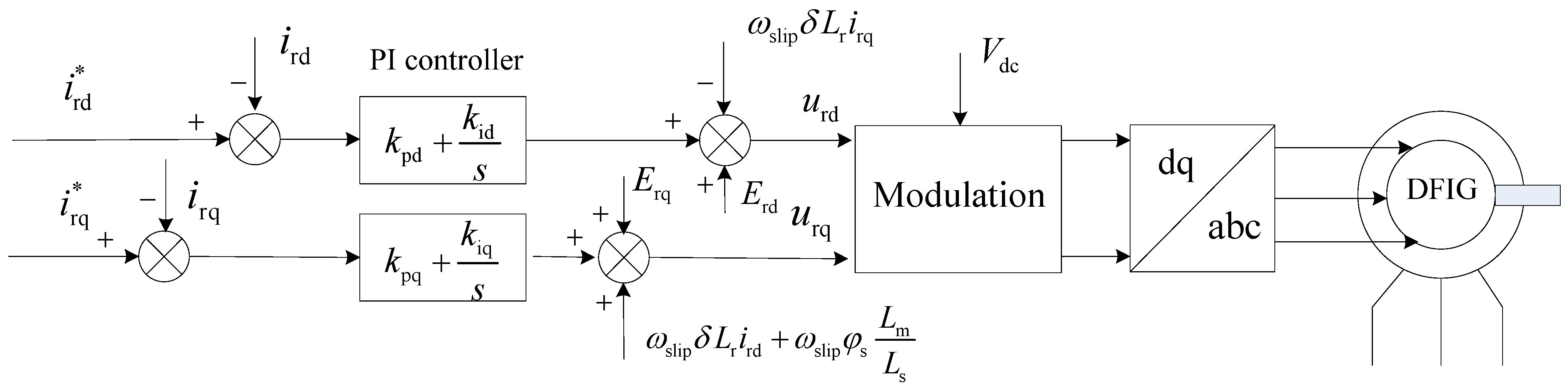 In normal operation, the diagram of RSC control is depicted in Figure 3, where the decoupling of d-q control-loops is achieved by adding the feed-forward compensation after the (proportional-integral) PI controller. Rotor voltage in abc frame is obtained from RSC and used for electromagnetic torque calculation by Equations (6) and (7). Vdc is the voltage of DC-link and used for the modulation of voltage. The rated value of Vdc is 1100 V.