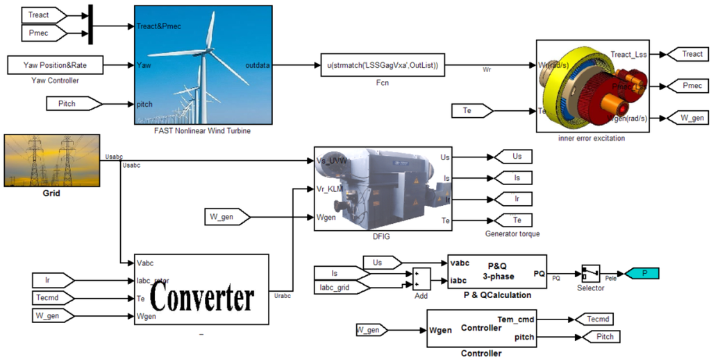 The two-mass drive train model in FAST is reduced to a single-mass model by deactivating DOF. Furthermore, gearbox ratio and generator inertia are set to unity and zero, respectively. In this way, turbine rotor and tower can be integrated into the subsystem model in MATLAB. Figure 4 shows the Simulink model of the complete system. Turbine rotor speed is transmitted to the gearbox. The reaction torque on LSS and mechanical power are then calculated and fed back to FAST. The DFIG rotor is connected to the grid through converter while the stator is connected directly. Tecmd is obtained by a look-up table and pitch regulation is activated according to the generator speed [17].