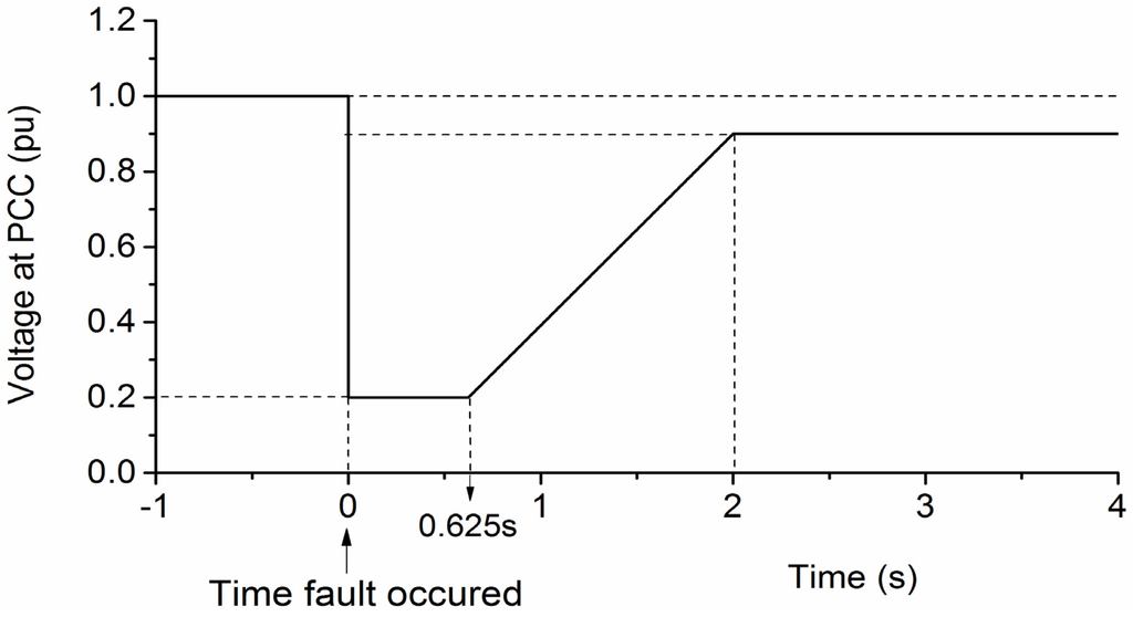 Power system operators have set specific requirements in order to connect wind turbines to the grid when the voltage at the point of common connection (PCC) suffers a significant drop in a very short time. The requirements in individual countries might be different [18,19,20]. The wind turbine needs to keep operating for 625 ms when the voltage at PCC dips to 20% of the rated value in China [21], as shown in Figure 5. Only when the voltage goes below the curve, wind turbines are allowed to disconnect. After the faults are cleared, active power is required to increase at the rate of at least 0.1 pu/s. These requirements are considered for the operation of single wind turbine in the study cases.