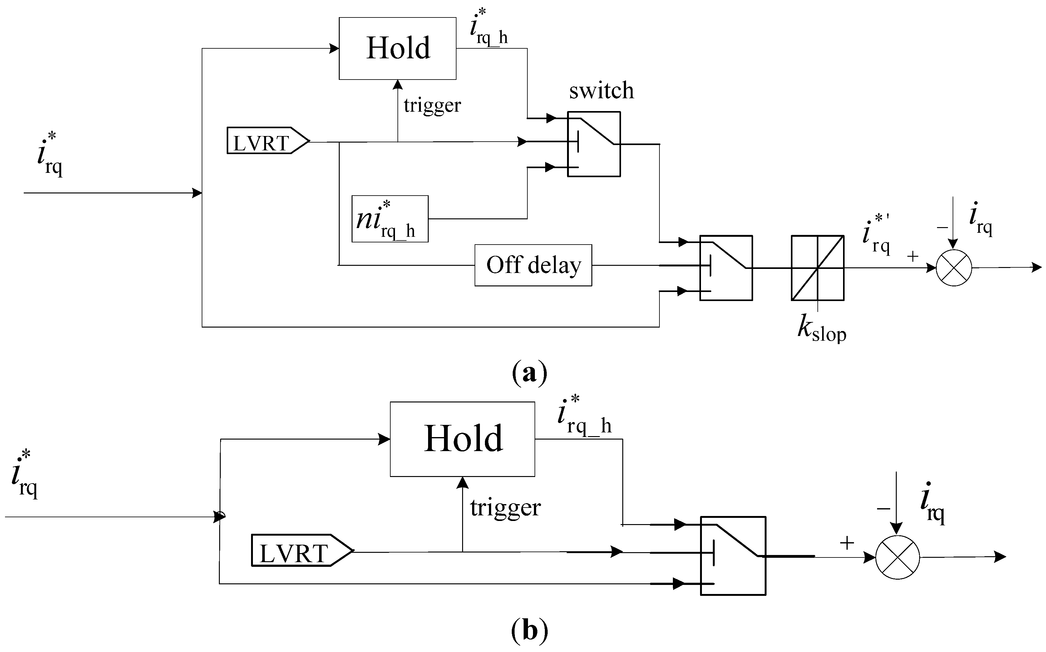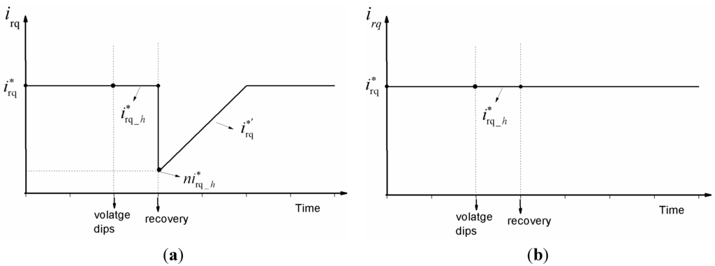The diagram of the control strategy is described in Figure 6a. The reference value i*rq will be hold once the LVRT signal is detected and the hold value is represented by i*rq_h. It leads to the active power dip during the hold time as well as the electromagnetic torque. Then i*rq_h will be decreased n times once the voltage recovers. The factor n is a calculated ratio of positive voltage after and before dip. In this way, the final reference value i*’rq will be increase at a certain rate (kslop) after the voltage recovery. The certain rate is determined mainly from the standpoint of electric devices and power system. However, the wind turbine dynamic response in the LVRT situation with the immediate power recovery (without the kslop) is analyzed in [7,10]. This diagram of control is described in Figure 6b. For a clearer description, Figure 7 shows the evolution of i*rq along the time.