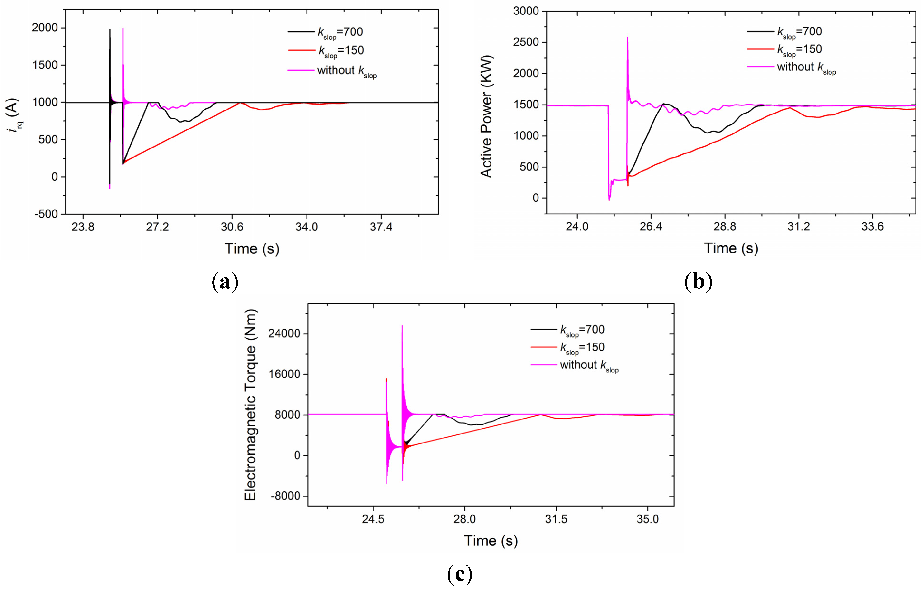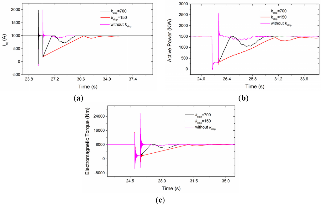In Figure 8a, it can be seen that the decoupled rotor currents have the same response before the voltage recovery. The spike due to the sudden voltage drop is obvious and it appears again when the voltage recovers for the control without kslop. However, it can be avoided if the current rises at a certain speed. The current transient can also be reflected in the active power, especially for the immediate recovery of power, shown in Figure 8b. Thanks to the hold current during the voltage dip, the total active power is decreased. The current drops to a certain value at the moment of voltage recovery for increasing the active power, and the rising rate is 157 kW/s when the kslop equals 150. The overshoot of pitch regulation leads to a sunken power around 28 s with the faster rising slope (kslop = 700). The similar response is presented in electromagnetic torque, as shown in Figure 8c.
