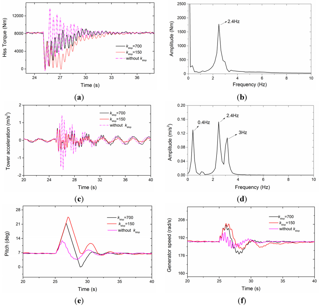Torsional oscillation is closely coupled with the tower side-side mode, and the equations of motion can be found in [23]. The impact due to the voltage dip can be transmitted to the tower and reflected on the acceleration which is harmful for the yaw bearing. In Figure 9c, the peak value of acceleration without the kslop is almost twice that with the kslop, and the kslop with a smaller value leads to less effect on the first side-side mode (0.4 Hz) oscillation of the tower, which can be seen clearly during 32–40 s. Except for the eigenfrequency of the first mode excited, the second eigenfrequency of 3 Hz and torsional oscillation frequency, shown in Figure 9d, can also be found. The decay of oscillation depends on the damping ratio of tower side-side mode—1.5 is used in this paper.