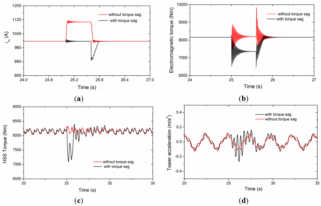 Figure 10c describes the impact on HSS with and without torque sag, and the fluctuation in normal operation is mainly caused by the wind shear and tower shadow effect. It can be seen that the control without torque sag has a small influence on HSS, but the impact is much greater if the electromagnetic torque is decreased suddenly. The HSS torque can dip approximately to 87% of the rated value in an instant and the gears will also experience torque sag. If the impact is frequent or severer, it might lead to damage to the oil film between gear teeth and result in wear and tear on the tooth surface. The larger oscillation on the acceleration of tower side-side mode is excited, as depicted in Figure 10d. Consequently, a tough converter that can sustain the continuous over-current without torque sag during small voltage dip is favorable for the mechanical loads.