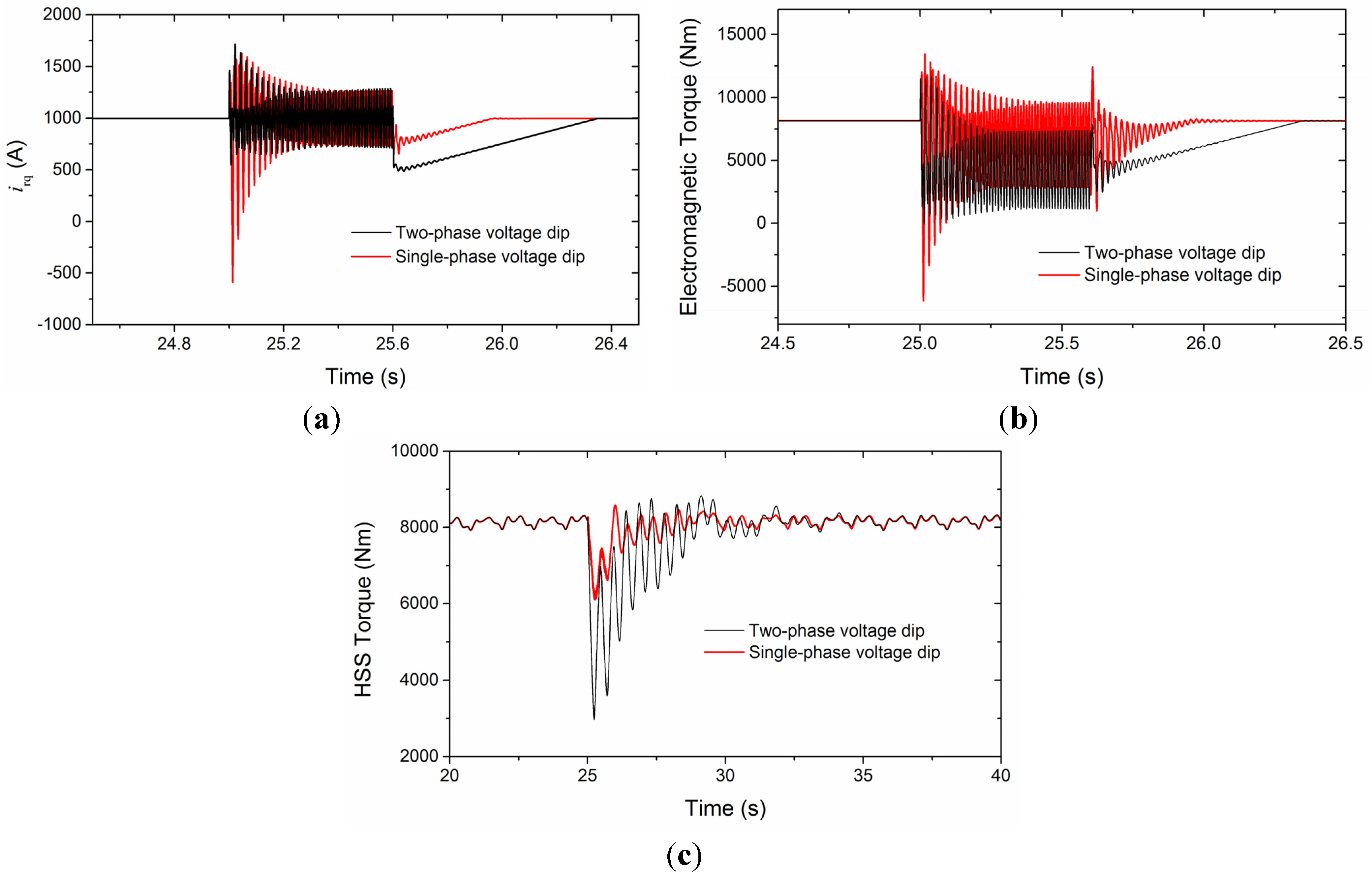 Evolutions of variables during single-phase and two-phase voltage dip: (a) decoupled rotor current; (b) electromagnetic torque; and (c) HSS torque.