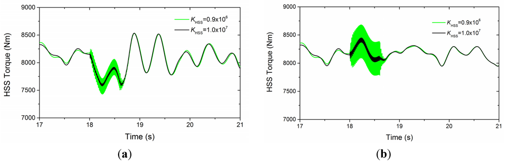 As described in Table 2, the second eigenfrequency mainly depends on the flexibility of the rotor and LSS with the invariant inertias while the higher eigenfrequencies are dominated by the gearbox. In practice, the coupling is a connection between the output shaft of the gearbox and generator and used for the misalignment of shafts, but it reduces the effective stiffness of HSS in the drive train model [8]. Figure 12 shows the relationship of the three eigenfrequencies with HSS stiffness and the vertical coordinate is logarithmic. KHSS should be set to 1 × 107 Nm/rad, if the coupling is not taken into account. When KHSS equals to 0.9 × 106 Nm/rad, resonance might be excited by the electromagnetic torque with 100 Hz oscillation.