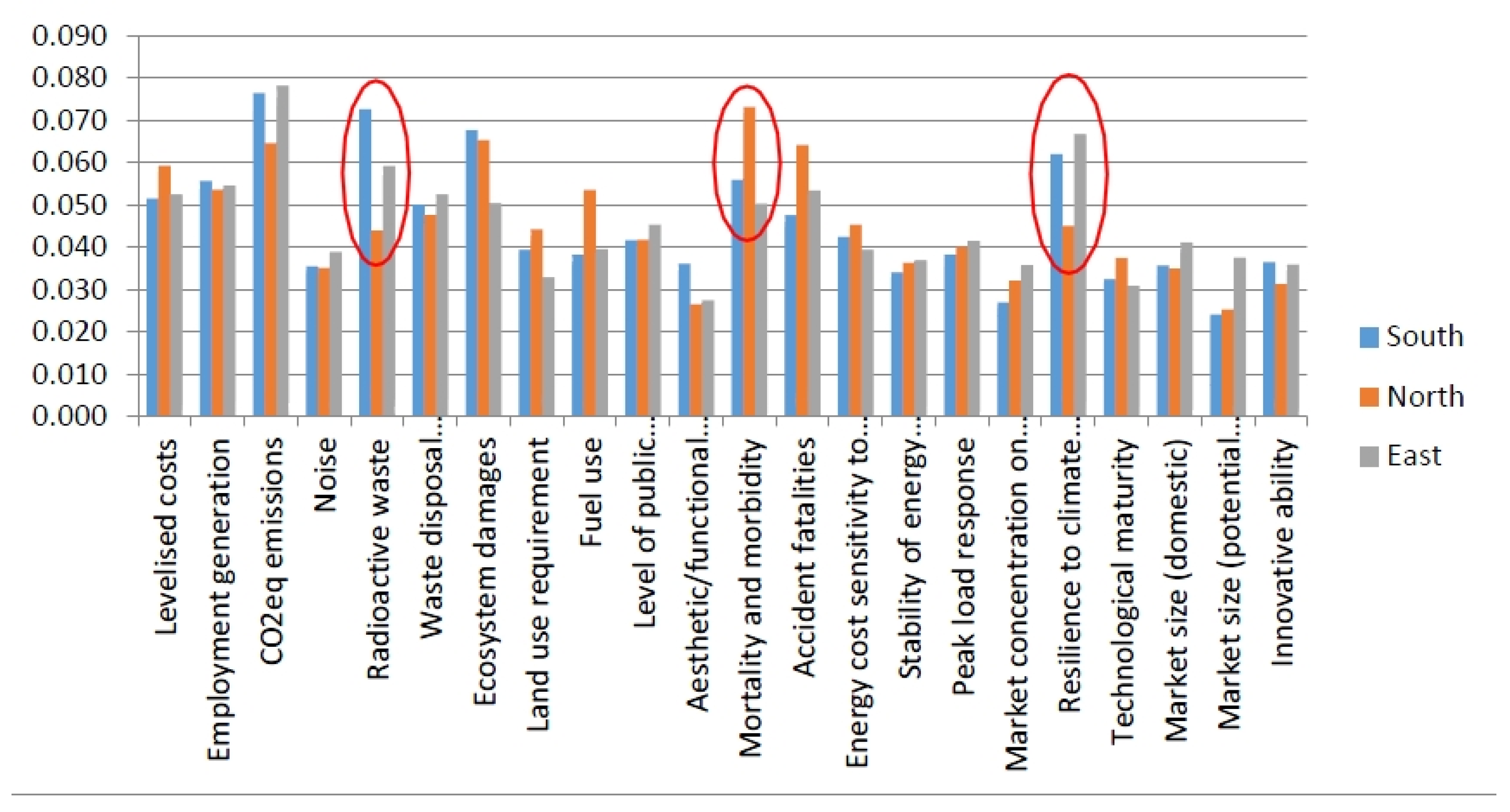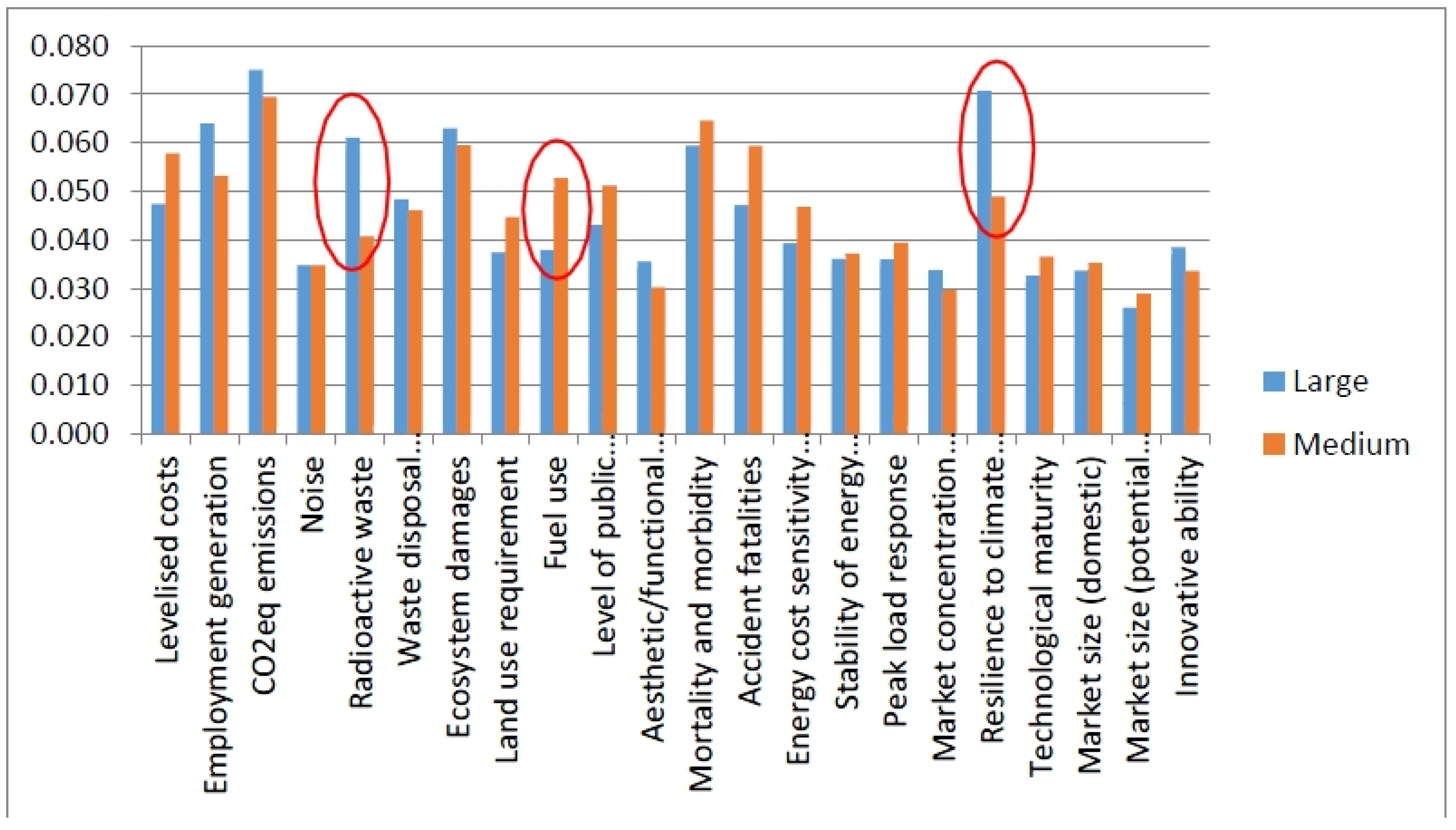 - Swing method: As the worst and best scores based on the selected evaluation criteria for each alternative energy technology were presented, respondents carefully look at the potential gains from moving from worst to best performance and then decide which of the criteria they want to first shift to best performance. As the first swing is valued at 100 units on a hypothetical value scale, the stakeholders assign a value (<100) to the second criterion they want to move to its best performance, then to the third and so forth until the last criterion is moved to its best performance. Likewise, the values obtained from this swing weighting process are normalized in criteria weights (percentages).