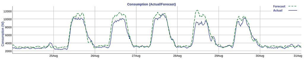 We applied a triple exponential smoothing model provided by OpenForecast [31] to predict the power consumption, since seasonal models are supposed to be a simple but feasible approach for short-term electricity demand [32,33]. Adequate results have been obtained using a triple exponential smoothing model with parameters (0.7, 0.1, 0.2), which correspond to the weight of recent data, trend and seasonality, respectively. The basis for these models are time series, where we use the historical consumption data for the past six same days (either working or high days). If we utilized information from the last successive days, the strong differences between workdays and weekends would distort the forecast values. Figure 3 illustrates the results of the actual (solid, blue) and predicted (dashed, green) consumption, where the difference in the power demand of workdays and the weekends becomes evident.
