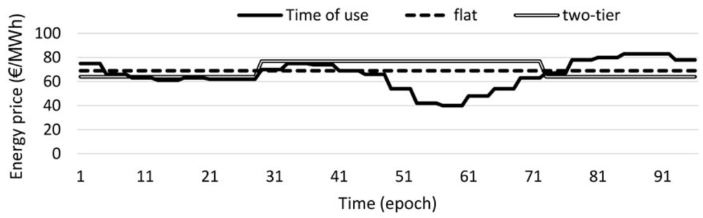 The scheduling horizon is a 24-h period divided into 96 epochs of a 15-min duration (though from the theoretical point of view, the duration of an epoch can be arbitrarily defined, most of the state-of-the-art commercialized smart meters use measuring intervals of 15 min). We start considering the minimization of the overall operational costs. The rewards for the recharge of the electronic devices above the mandatory threshold are price incentives corresponding to the daily average electricity price. Note that such incentives do not impact the actual bill, since they appear exclusively in the objective function of the MILP model. The electricity prices vary according to three different tariff types currently applied by an Italian energy provider [35] and reported in Figure 4: The flat tariff imposes a constant price during the whole day; the two-tier tariff applies two different prices according to the time of the day (low price from 00:00 to 07:59 and from 19:00 to 23:59, high price from 08:00 to 18:59); the time-of-use tariff exhibits hourly variations according to the fluctuations of the energy market. Prices for selling energy surpluses by injection into the grid are obtained by multiplying the actual purchase prices by a scaling factor (i.e., ). The initial state of charge of the storage bank is assumed to be . In our implementation, the MILP model is solved by means of the AMPL/CPLEX [36] solver.