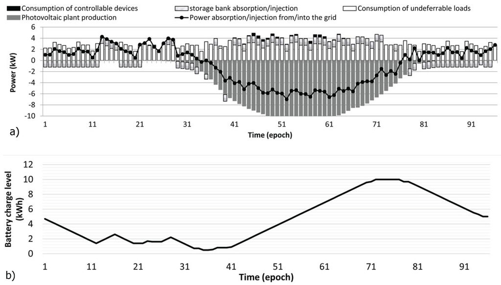 Concurrently, the “smart building” paradigm [4,5] aims at improving the energy efficiency and occupant’s quality of living by integrating intelligent control mechanisms enabled by information and communication technologies (ICT). The goal of such systems is the optimization of the building operation by integrating information about the users’ preferences and activities, ambient conditions and electricity supply availability. In particular, demand-response interactions make it possible to equalize the load experienced by the grid by lowering the consumption in the case of power production scarcity or by increasing power absorption when production exceeds demand. To do so, the smart building must include distributed generation plants, storage capabilities and controllable electrical loads in a building-integrated microgrid fashion [6,7,8]. Each smart building can be managed by a dedicated control system, which schedules the charge/discharge cycles of the storage bank and the runtime of the power loads, in case they exhibit some malleability (e.g., deferrable loads, such as the recharge of the batteries of electric vehicles or electronic devices, or tunable loads, such as cooling and heating systems): several management policies have been investigated, mostly aimed at the minimization of the operational costs in the presence of time-variable energy tariffs [9,10].