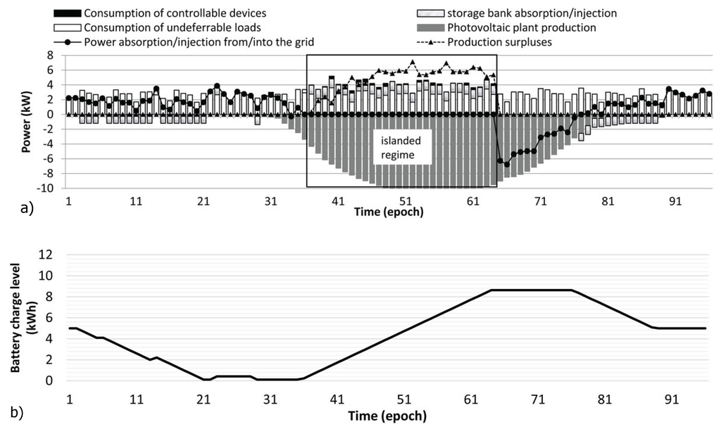 Conversely, during the cloudy weekday, the photovoltaic production is never sufficient to completely fulfill the energy demand of the smart office. As depicted in Figure 7, in this scenario, there is no convenience in selling energy back to the grid: all of the photovoltaic production is either immediately self-consumed or stored in the battery. However, in this case, the battery charge/discharge cycles are mainly driven by the energy price fluctuations, rather than on the amount of photovoltaic generation. In such a scenario, no request issued by the DSO about islanded operation could be fulfilled.