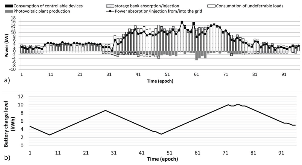 We now detail the analysis of the numerical results obtained for two reference days (a sunny weekend day and a partially-cloudy working day, respectively), assuming the usage of time-of-use tariffs. The corresponding energy exchanges with the grid obtained by means of the EMS are reported in Figure 5, Figure 6 and Figure 7. The trends depicted in Figure 5 show that during a sunny weekend, the photovoltaic plant generation is sufficient to avoid energy purchases, to recharge the battery storage bank and even to sell production surpluses for most of the daylight time. In order to leave a sufficient capacity to store the power generated by the solar panels, the storage bank is mostly discharged during the early morning. The battery is also discharged during the evening period, in order to reduce the amount of purchased energy when prices are high (see Figure 4).
