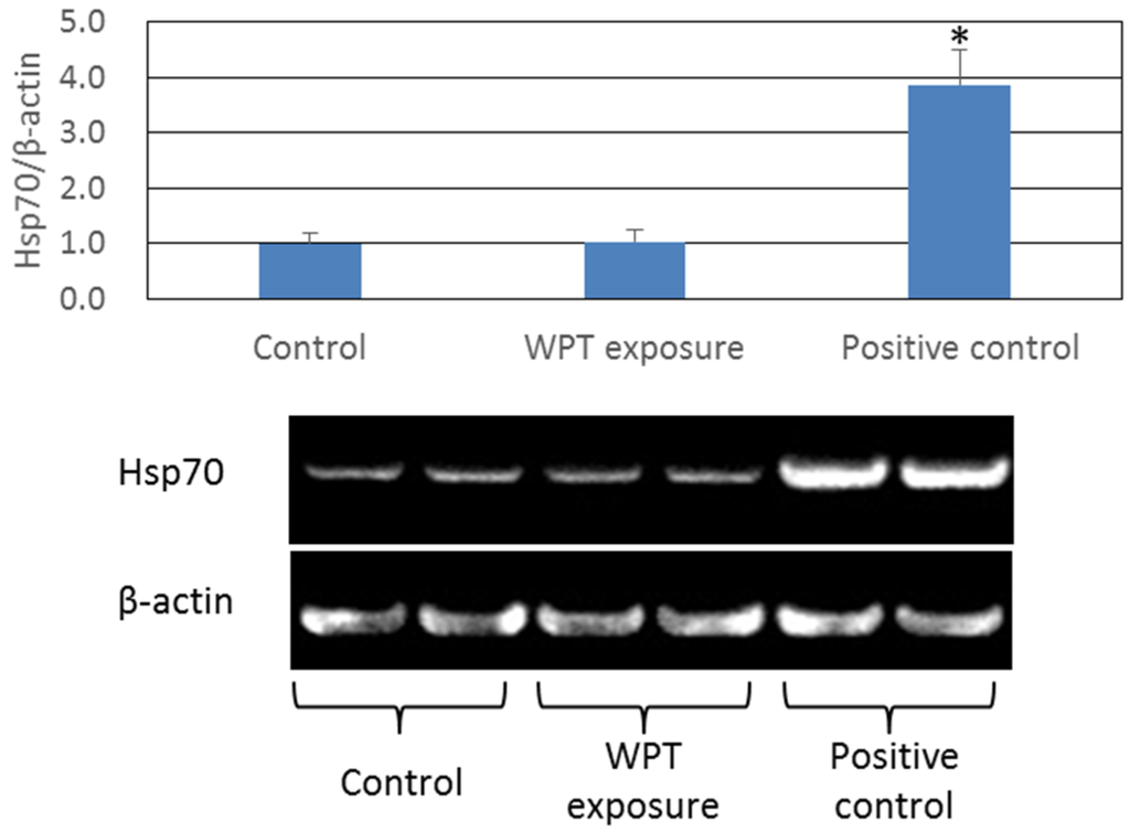 The increase in expression of Hsps is related to the activation of the heat shock transcription factor (HSF), which regulates the expression of Hsps, and binds to the heat shock element (HSE) on heat shock genes. In the absence of heat stress, HSF is inhibited by Hsps, and, therefore, exists in a monomeric form that has no DNA-binding activity. When proteins unfold under heat stress conditions, Hsps bind to the unfolded proteins as a molecular chaperon to facilitate refolding, and release HSF. HSF assembles into a trimeric form that is exhibits DNA-binding activity, phosphorylates and then translocates into the nucleus. In the nucleus, HSF binds to HSEs and activates transcription of Hsp genes, e.g., Hsp 27, 70 and 90, to synthesize new Hsps [29,30,31]. In our results, the cells under heat stress conditions showed a statistically significant increase in expression of Hsps 27, 70 and 90 compared with control cells. In contrast, we found no statistically significant differences in expression of Hsps 27, 70 and 90 in cells exposed to WPT for 24 h compared with control cells. These results suggested that WPT exposure did not induce detectable cell damage or disrupt Hsp expression.