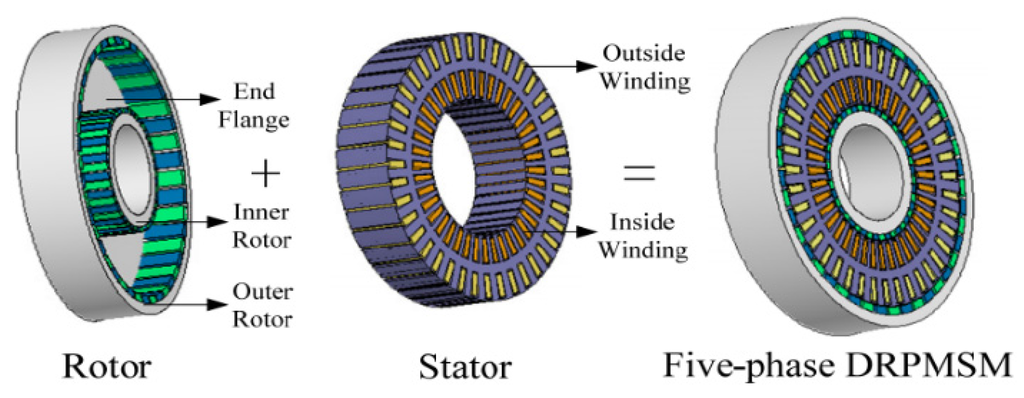 - Li, Y.; Zhao, J.; Chen, Z.; Liu, X. Investigation of a Five-Phase Dual-Rotor Permanent Magnet Synchronous Motor Used for Electric Vehicles. Energies 2014, 7, 3955–3984. [Google Scholar] [CrossRef]