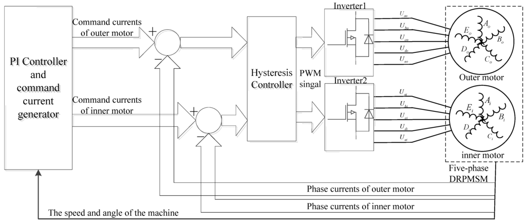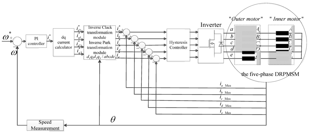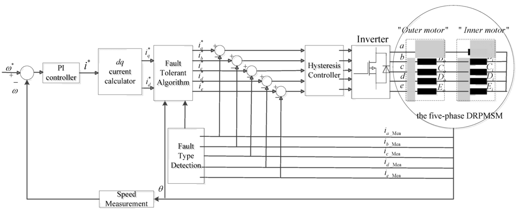 This paper investigates fault-tolerant operation of five-phase DRPMSM under all kinds of open-circuit fault conditions. As shown in Figure 1, the five-phase DRPMSM consists of two rotors and one stator, which combines the advantages of high fault tolerance of multi-phase machines and high power density of dual rotors machines and permanent magnet machines. The motor can be seen as a combination of an “inner motor” and “outer motor”, of which the inner motor is composed of the inner rotor and the inside windings of the stator, and the outer motor is composed of the outer rotor and the outside windings of the stator [11]. If inside and outside windings of the stator are connected in series, the motor can be driven by only a set of five-leg drivers, which is the machine’s series drive mode. Figure 2 shows the control block diagram when the motor operates normally in series drive mode, in which fundamental current components and third harmonic current components are both considered. If the inside and outside windings of the stator are connected in parallel, two sets of five-leg drivers are needed and that is called the machine’s parallel drive mode.