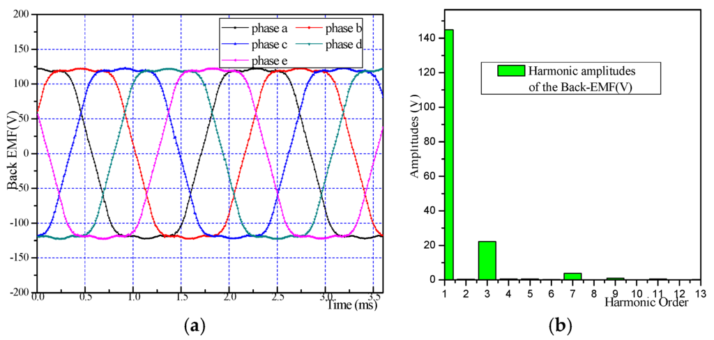 A 44 pole-40 plot five-phase DRPMSM with rated speed 1200 rpm and rated electromagnetic torque 18 Nm is designed in Maxwell. The back-EMF of the motor is a superposition of the inner motor and out motor. Operated at speed of 1200 rpm at no load, the motor’s back-EMF waveform and its harmonic component analysis are shown in Figure 3. Using Fourier decomposition, fundamental and third harmonic components are only considered, and the back-EMF of the motor can be described as: