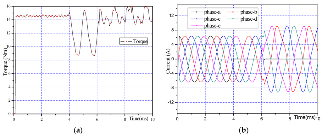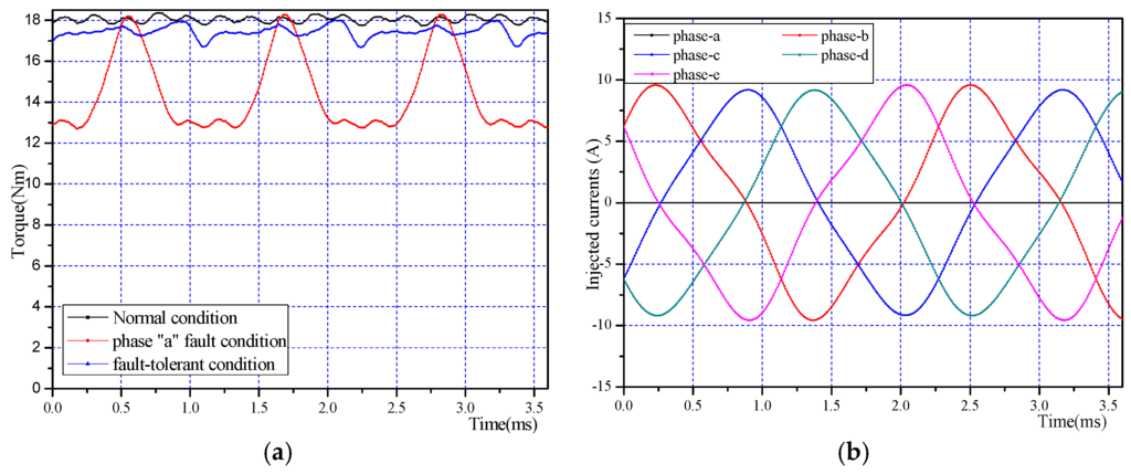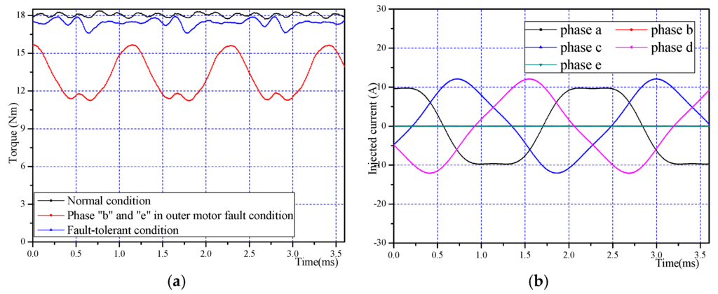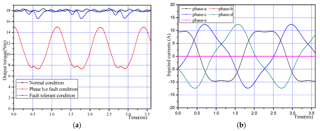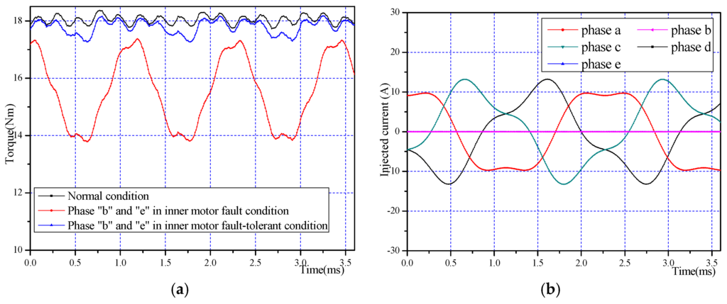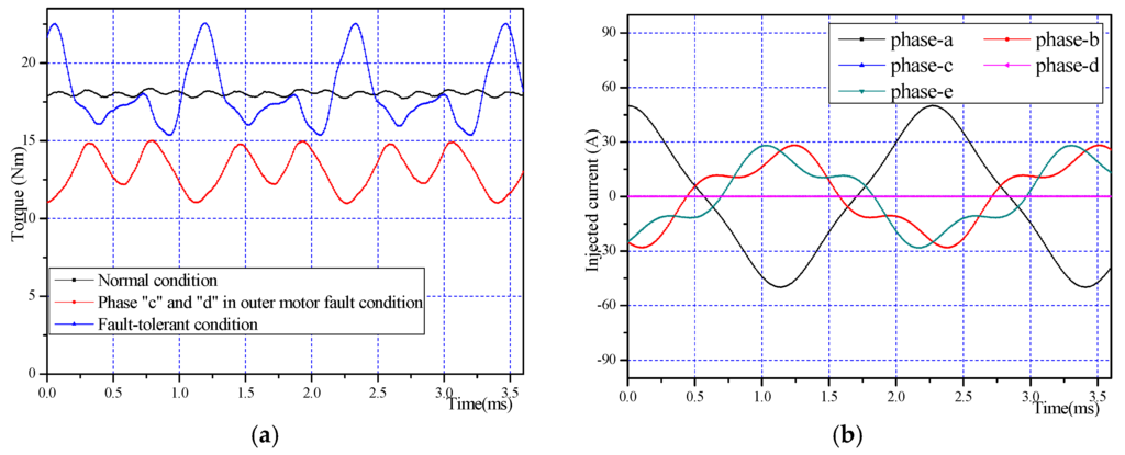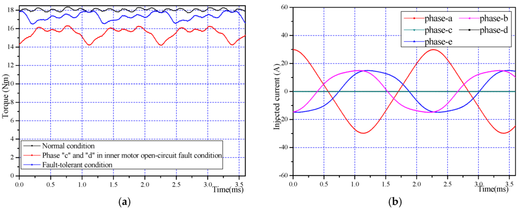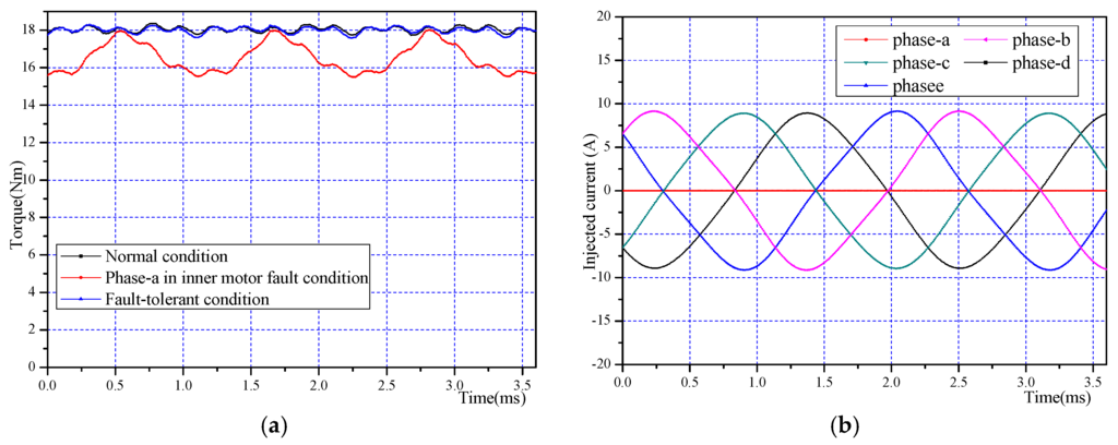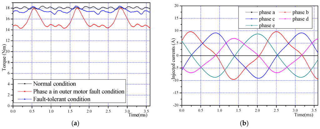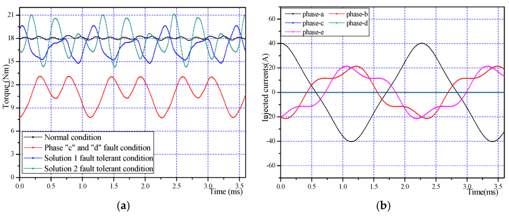 Considering the known variables (, ), the solution to the fault-tolerant currents is obtained as shown in Table 2. In this solution, the average torque under the fault tolerant condition is equal to that under normal conditions. It can be calculated that the maximum fundamental amplitude value in injected fault-tolerant currents is 1.76 times the fundamental current amplitude value under normal conditions. The sixth-order torque pulsation in electromagnetic torque is not considered, and the additional degrees of freedoms are used to constrain the fundamental components of the fault-tolerant currents as equal. The torque and current results are shown in Figure 7. Ninety-eight percent of the normal torque (17.71 Nm) with 10.4% ripple is produced when the motor operates under fault-tolerant conditions.