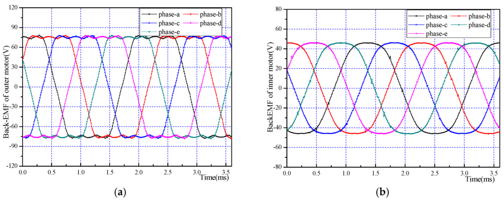 When the machine operates in parallel drive mode, the inside stator windings and the outside stator windings of the five-phase DRPMSM are driven by two sets of inverters, respectively, as shown in Figure 9. Outer motor and inner motor are fed by inverter 1 and inverter 2, respectively. One DC voltage source and two different levels of DC-DC converters are used to supply the DC-bus voltage of the two inverters. Unlike the machine operated in series mode, the open-circuit fault in stator windings of inner motor or outer motor only cause corresponding side faults. Therefore, the back EMF of the inner motor and outer motor must be considered separately. Figure 10a shows the back EMF waveform of the inner motor and Figure 10b shows the back EMF waveform of the outer motor. Table 5 shows the data of back EMF and the injected currents that contain a third harmonic component under normal operation.