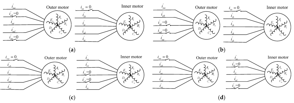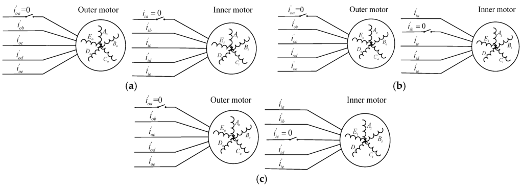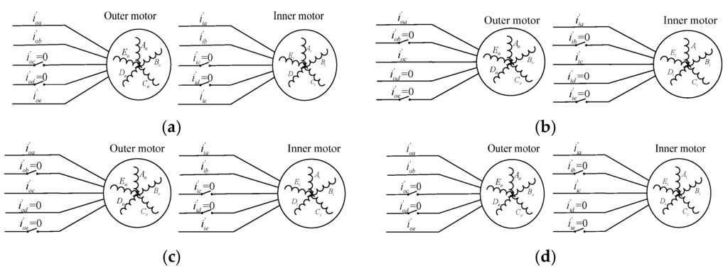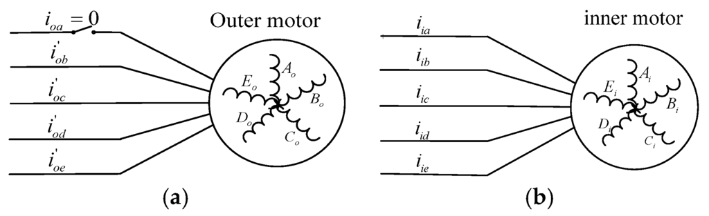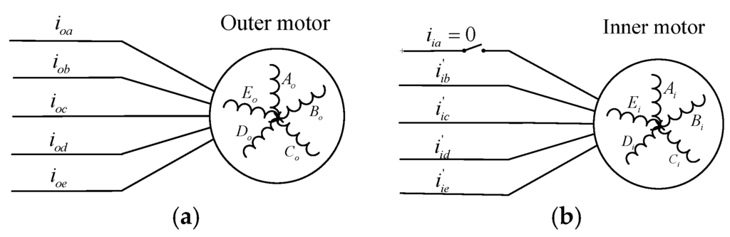 For five-phase single-rotor PMSM fault-tolerance control strategies, much significant work has been done [13,14,15,16,17,18,19,20,21,22,23,24,25,26,27,28,29,30,31,32]. By injecting proper current in the remaining healthy phases under open-circuit fault conditions, the magnetomotive force (MMF) whose amplitude and rotational speed are the same as normal conditions can be generated [14,15]. However, this method cannot obtain the unique current solution, and there is larger torque ripple in the electromagnetic torque, and the total ohmic loss is not minimal either. For single-phase fault in five-phase PMSM, Dwari and Parsa [16] eliminated the torque ripple in the electromagnetic torque and minimizes the total ohmic loss by using the theory of mirror symmetry of the currents in the heathy phases, but it cannot achieve maximum electromagnetic torque as the excitation currents are not equal in healthy phases. References [17,18,19] maximize electromagnetic torque and eliminate the torque ripple under certain possible fault cases in five-phase PMSM by injecting excitation currents with a third-harmonic component. Dwari and Parsa [20] studied possible fault cases and fault-tolerant operation of a five-phase brushless DC motor, whose back electromotive force (EMF) is a trapezoidal wave. Due to limitations of the drive circuit topology and stator windings of the machine in the aforementioned work, the sum of currents in healthy phases is constrained to zero. In [21,22], an additional bridge leg is added to the five-phase inverter to eliminate this constraint, and a smooth electromagnetic torque is obtained. References [23,24,25,26] discussed fault-tolerant operation under different stator winding configurations (pentacle, pentagon and star connection), and the result shows that the machine possesses higher fault-tolerance performance and smaller electromagnetic torque ripple when the stator winding is configured in a pentacle or pentagon. In [27,28], based on vectorial approach control and degrees of freedom, fault-operation of a seven-phase axial flux machine is investigated. In [29,30], a global fault-tolerance control technique is proposed, which can be applied to analyze all possible fault cases in any multi-phase motor regardless of the configuration of the motor’s stator windings. Mohammadpour et al. [31] proposed an iterative control strategy for m-phase permanent machines under fault tolerant operation. Kestelyn and Semail [32] proposes a novel way of generating optimal current references in real time to obtain a constant torque regardless of the number of open circuited phases in an m-phase PMSM for practical applications. Previous works only concentrate on single rotor motors. As for five-phase DRPMSM, as there are two kinds of drive modes and the back EMFs of the inner motor and outer motor are different, previous work cannot be applied to five-phase DRPMSM directly, and also the interaction between the inner motor and outer motor under fault-tolerant conditions was not investigated in previous work.