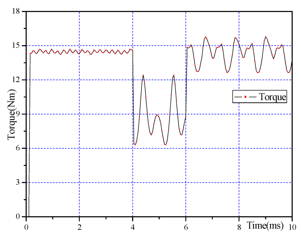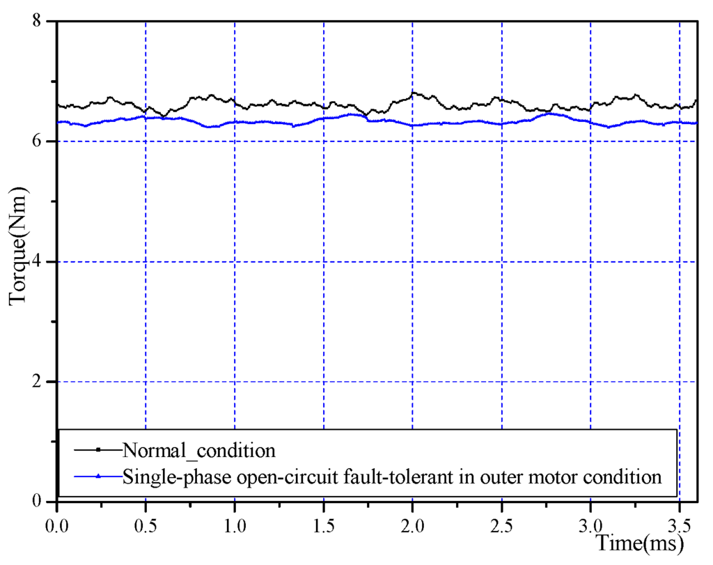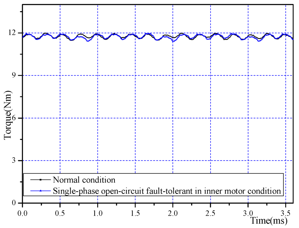 in which, Pp−l is power loss of each VSI leg in parallel drive mode, Tp−f = 18.08 Nm is torque obtained by FEA in parallel drive mode, Ts−c =14.41 Nm is torque obtained by co-simulation results, Ii−rms = 6.36/ A is RMS values that pass inner motor, Io−rms = 6.36/ A is RMS values that pass outer motor. We can calculate that Pp−l is equal to 36 W, which is much smaller than Ps−l. As a fault occurs at 4 ms, the electromagnetic torque is reduced to 8.56 Nm with 49.3% ripple, whereas 14.31 Nm of torque with 16.2% ripple is produced under fault-tolerant conditions (6–10 ms).