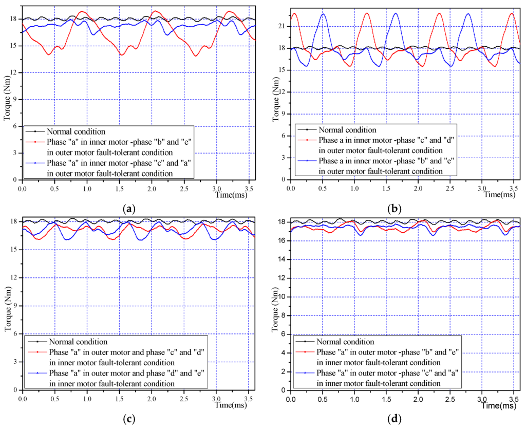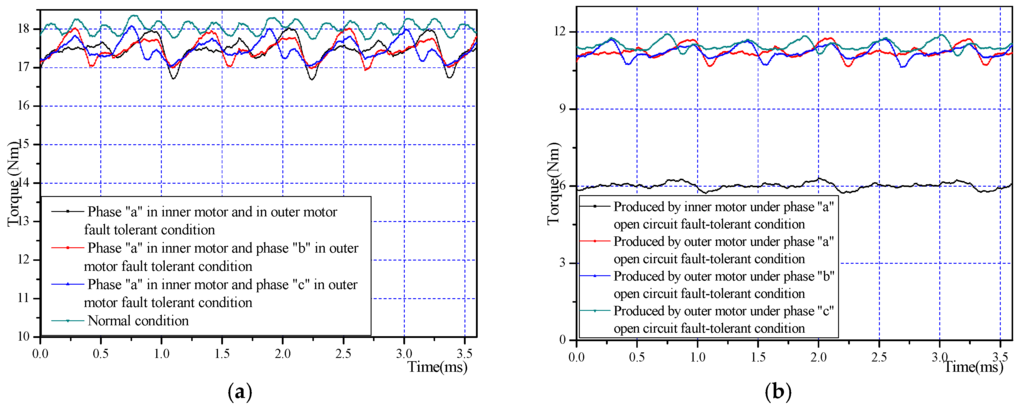 From the above results, it can be found that the average torque can be maintained at 93.8%–99.8% of the normal torque after the open-circuit fault-tolerant techniques are adopted in either serial drive mode or parallel drive mode. However, the torque ripple is still larger than under normal conditions. When the motor operates in serial drive mode, under single-phase open-circuit fault conditions, the fault-tolerant technique only needs smaller excitation current. However, fault tolerant currents are larger for double-phase fault types, especially for adjacent double phase faults. For adjacent double-phase faults, the additional degree of freedom can be used to constrain the fundamental components to be equal or to satisfy zero sixth-order torque pulsation. Both these two solutions are solved and the torques produced respectively by the two solutions are compared. The solution for which the additional degrees of freedom are used to eliminate sixth-order torque pulsating is adopted for smaller torque ripple. However, the additional degrees of freedom are used to reduce the fundamental amplitude value of fault-tolerant currents under non-adjacent double phase fault conditions. It is worth noting that the adjacent double phase fault is the most severe of all the fault types.