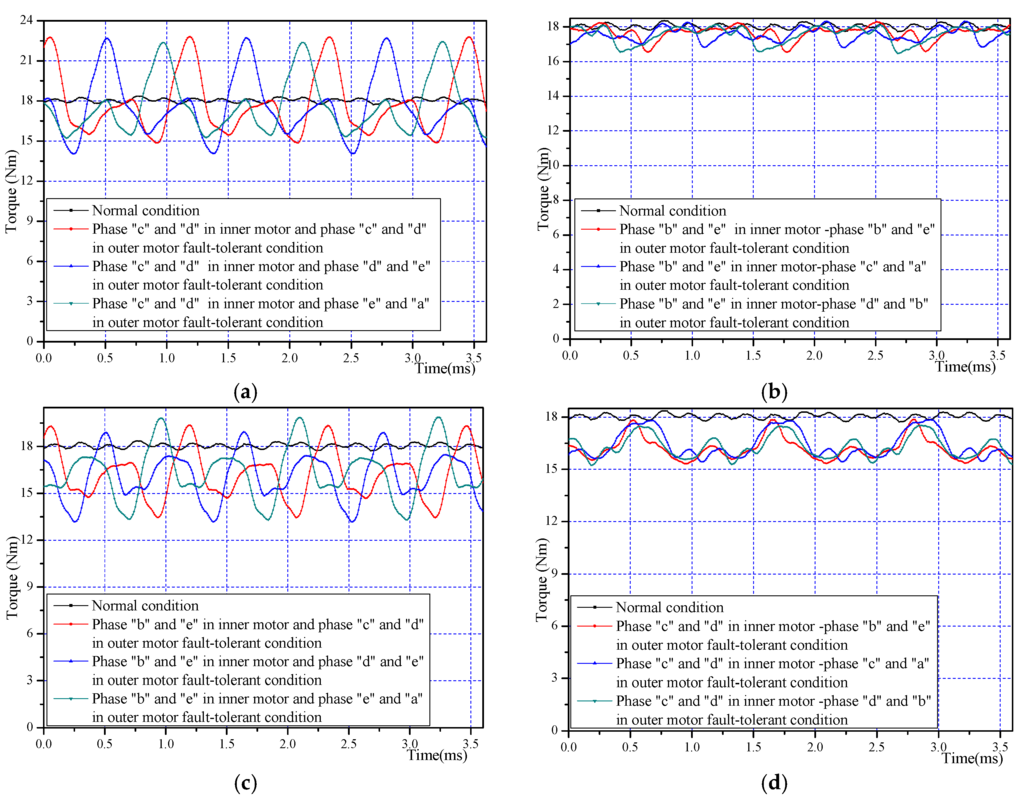 (2) When the five-phase DRPMSM operates in parallel drive mode, the third harmonic content of injected currents can be controlled respectively according to the third harmonic contents of the inner and outer back EMFs. Under fault-tolerant conditions, by analyzing the torque produced by the inner motor, outer motor and their linear addition, the inner motor and outer motor are decoupled, and an open-circuit fault in one side of the motor has little impact on the torque characteristics of the other side of the motor.